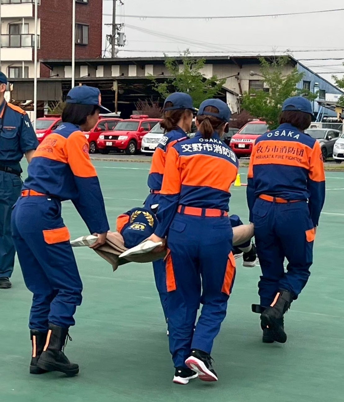 災害現場などで要救助者を安全かつ効率的に運ぶための技術を学びました。