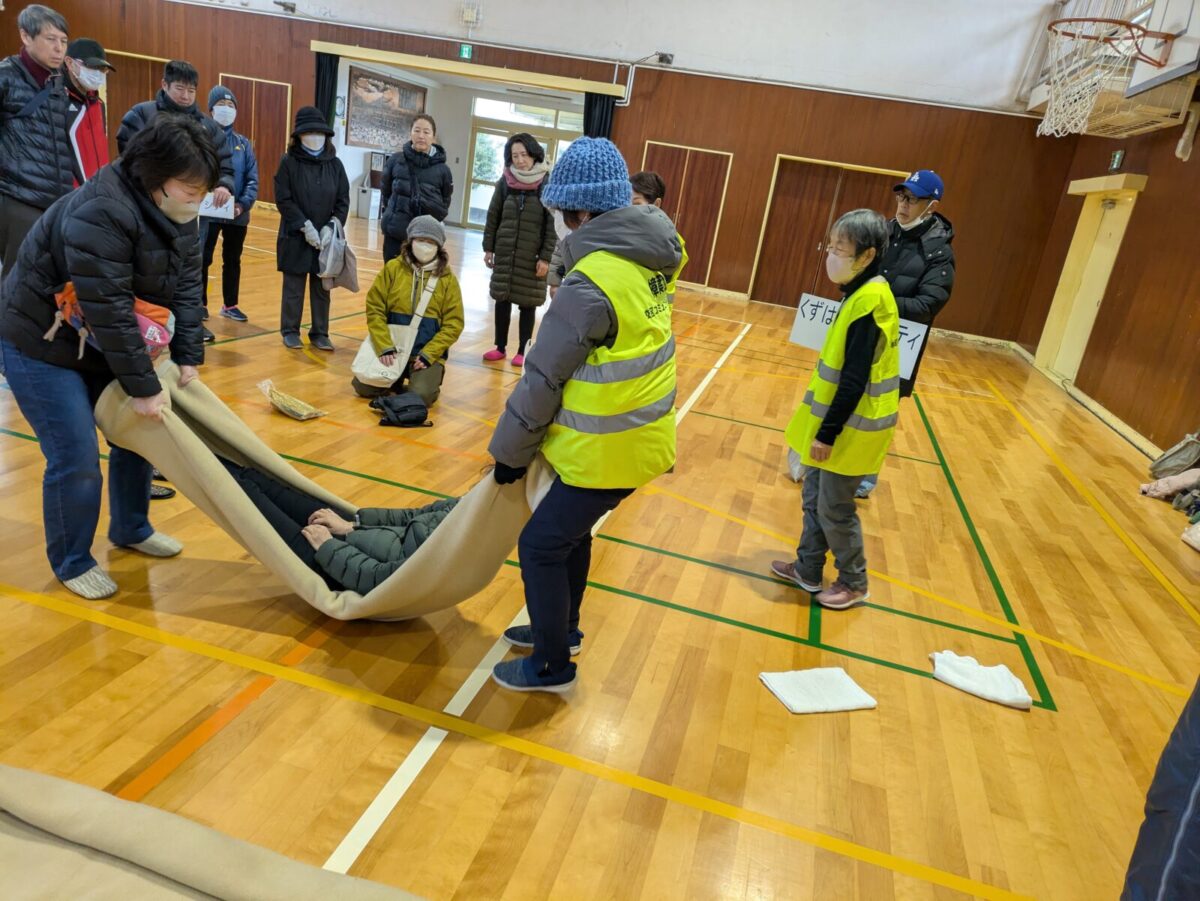 身近なもので応急担架をつくる方法として、毛布のみで搬送する方法を実践しました。