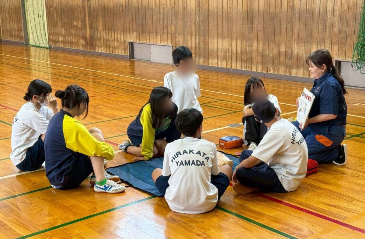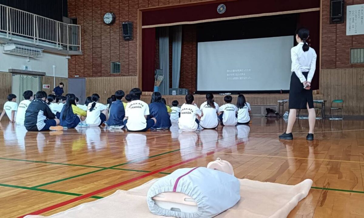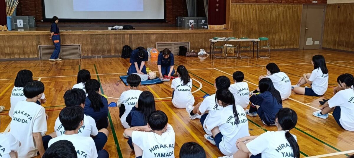 令和7年6月20日(金)枚方市立山田中学校2年生に対し、保健体育の授業の一環として救命講習を行ないました。