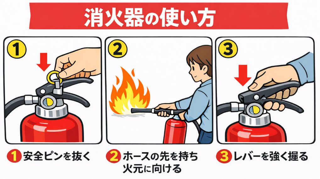 消火器は、備えているだけでなく、使い方を知っていることが大切です。