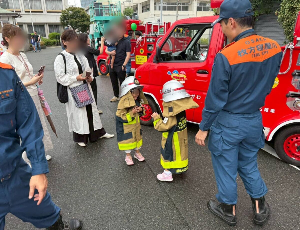 その中で、枚方寝屋川消防組合職員の方々と枚方市消防団(津田分団・女性分団・本部)で、消防士の衣装を着てミニ消防車と記念撮影コーナを担当。