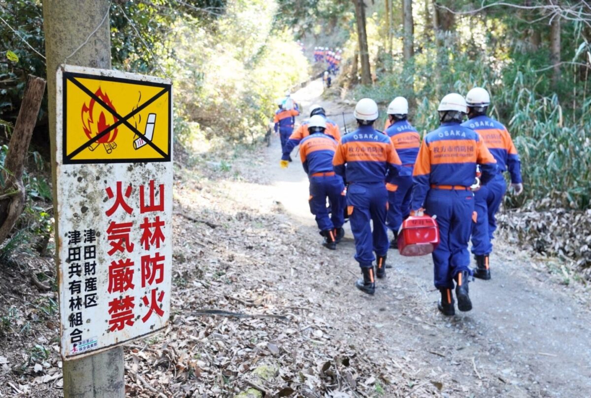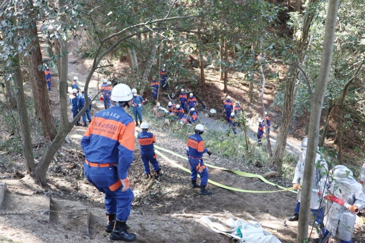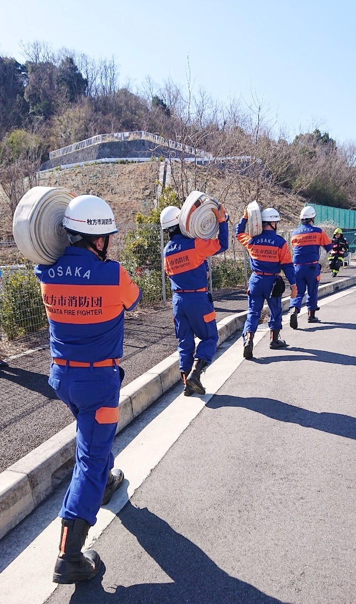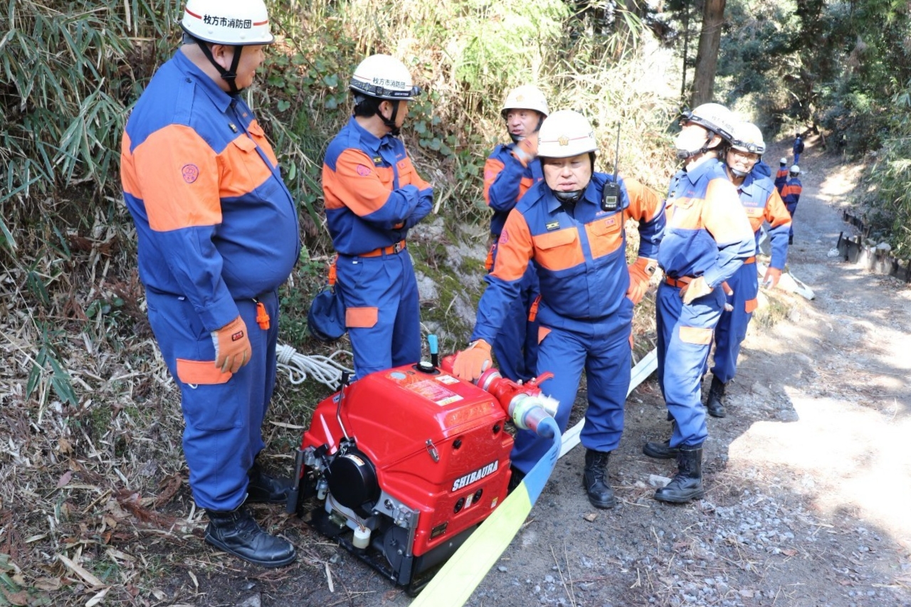 令和7年3月9日(日)、枚方市津田山手にある大阪府立北大阪高等職業専門校において、令和6年度 枚方市消防団山林火災防ぎょ訓練が枚方寝屋川消防組合枚方東消防署と大阪広域生コンクリート協同組合の合同により実施されました。