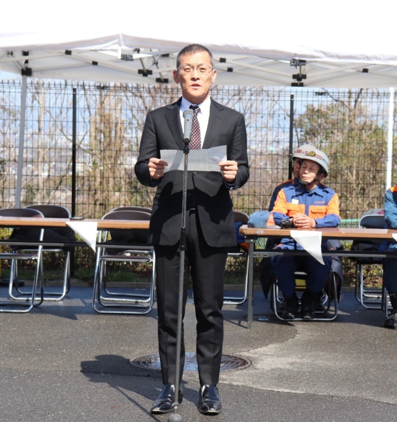 開会式では、山林火災防ぎょ訓練担当の小北副団長より中団長に訓練開始報告がなされ、その後、枚方寝屋川消防組合枚方東消防署 山内署長より挨拶があり、続けて訓練に関する注意事項の説明がありました。