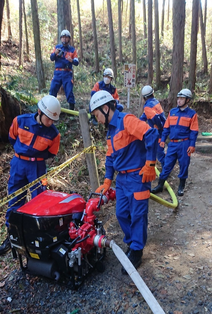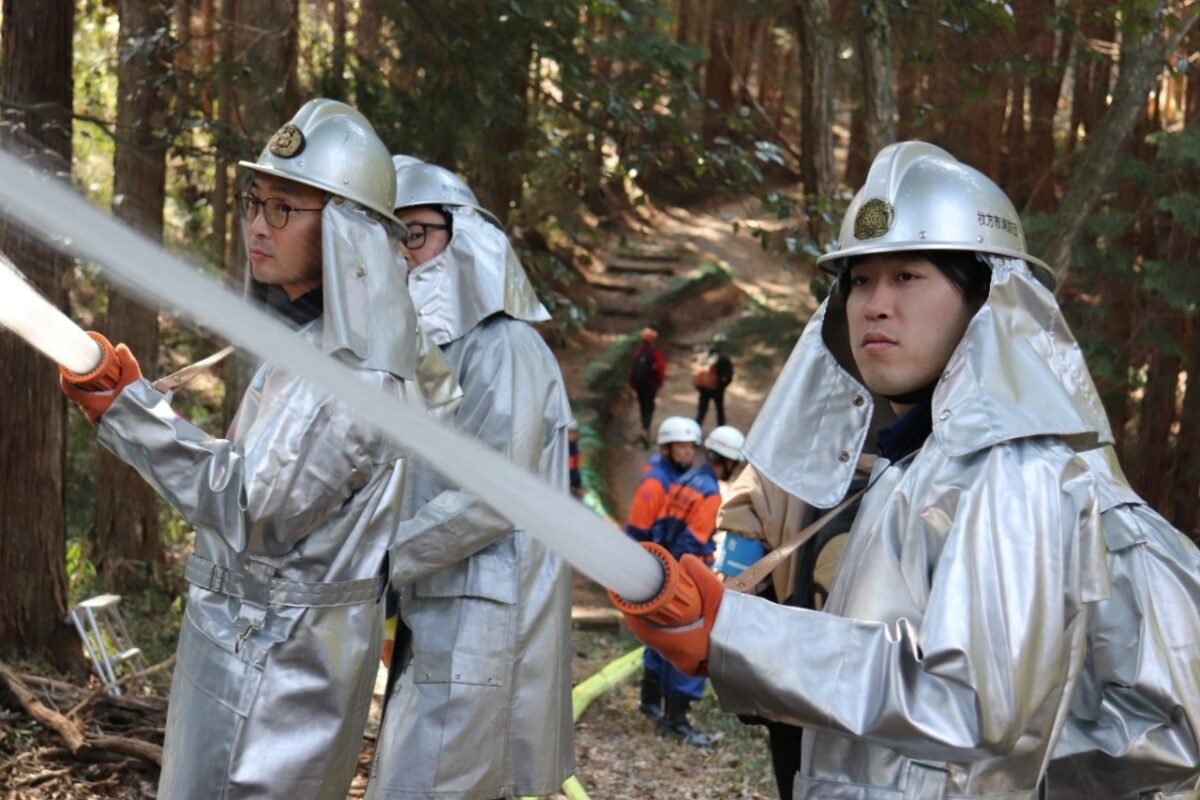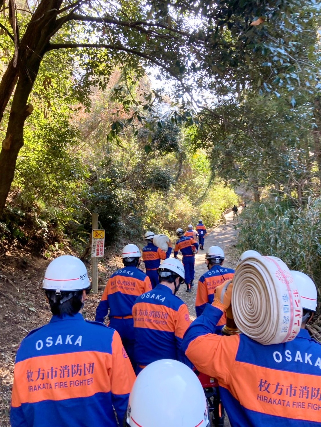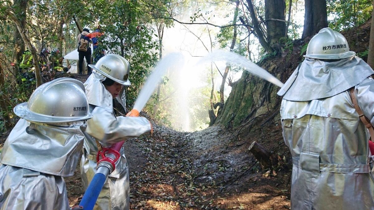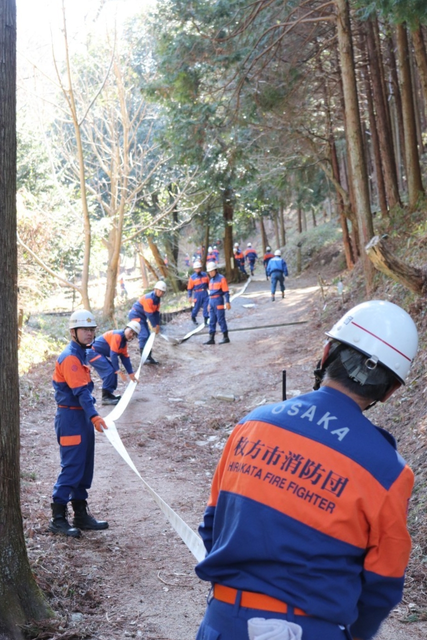 この山林火災防ぎょ訓練は、実践想定訓練を実施することにより、山林火災に迅速かつ的確に対応する能力を向上させ、枚方東消防署と連携して山林火災防ぎょ活動を実施するうえで不可欠な連携体制の確立及び消防団指揮体制の充実強化を図るためのものです。
