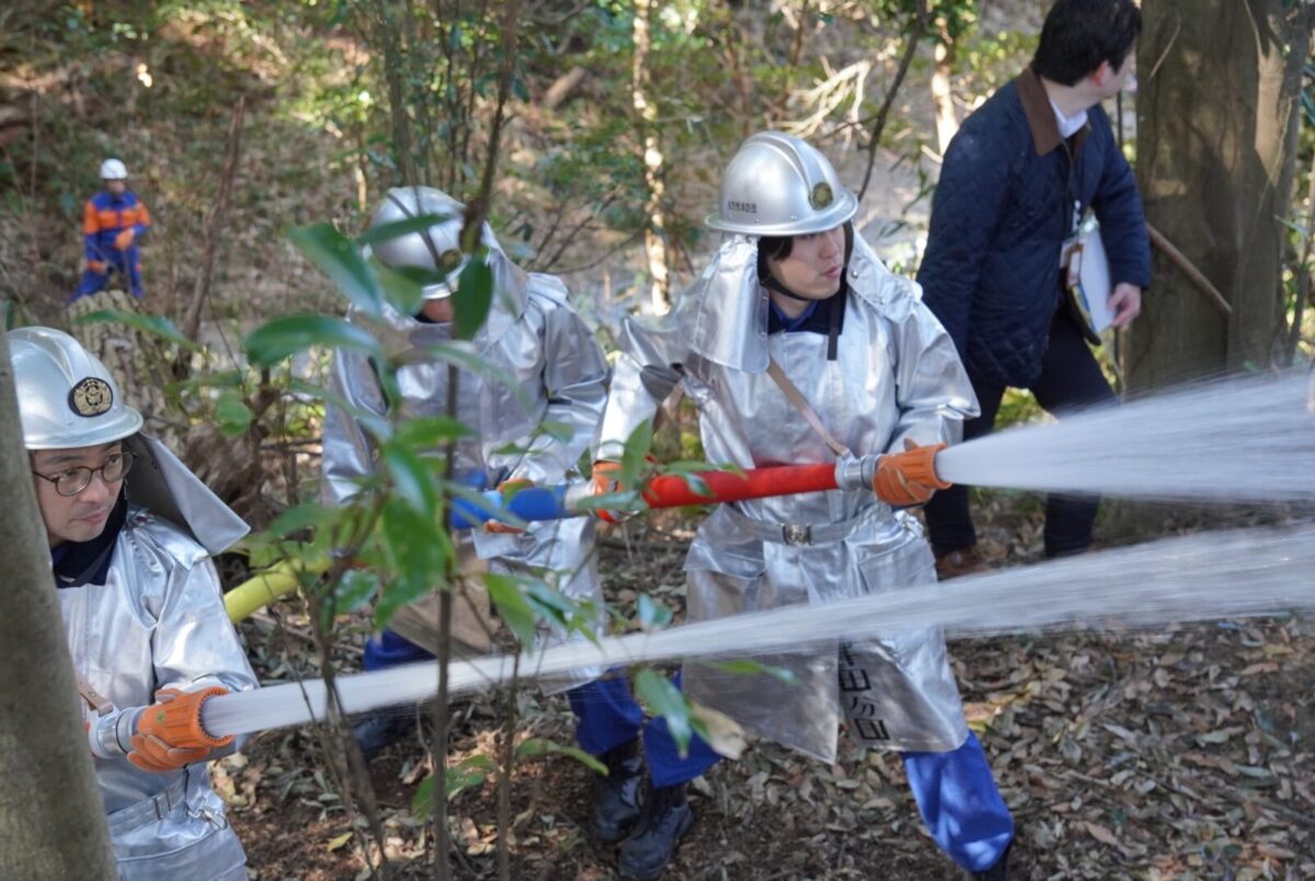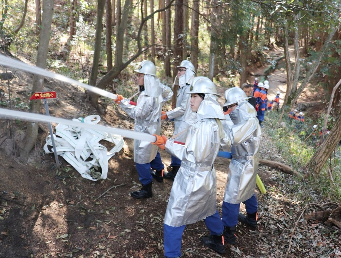 訓練想定は、令和7年3月9日の午前9時ごろ、津田山(国見山)B9ポイント北側の山林より出火し東側へ燃焼が拡大しているというもので、出動指令を受けた東部方面に所属する津田分団・氷室分団・菅原分団・殿二分団・樟葉分団が消火活動を行うというものです。
