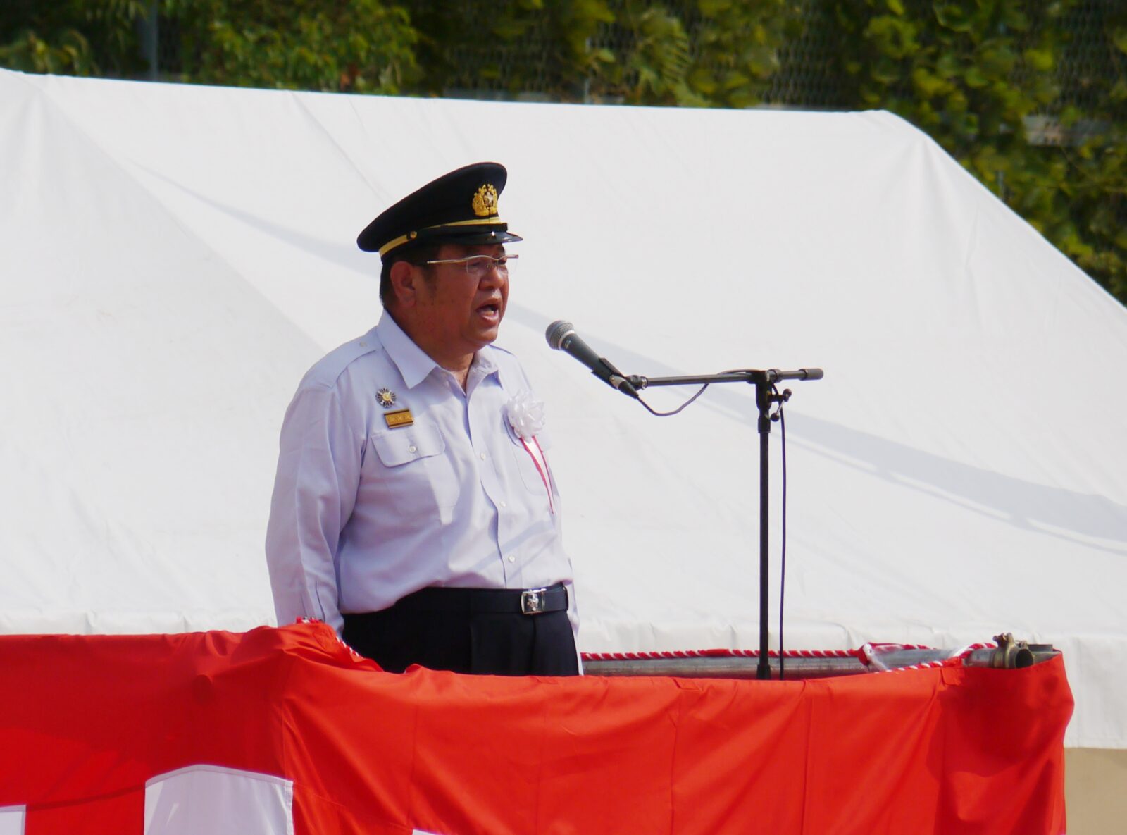 優良消防団員の表彰のあと、御来賓の祝辞を頂戴して御紹介を受け、その後国旗が降納され令和7年度 大阪府消防協会北河内地区支部総合訓練大会の幕が降ろされました。