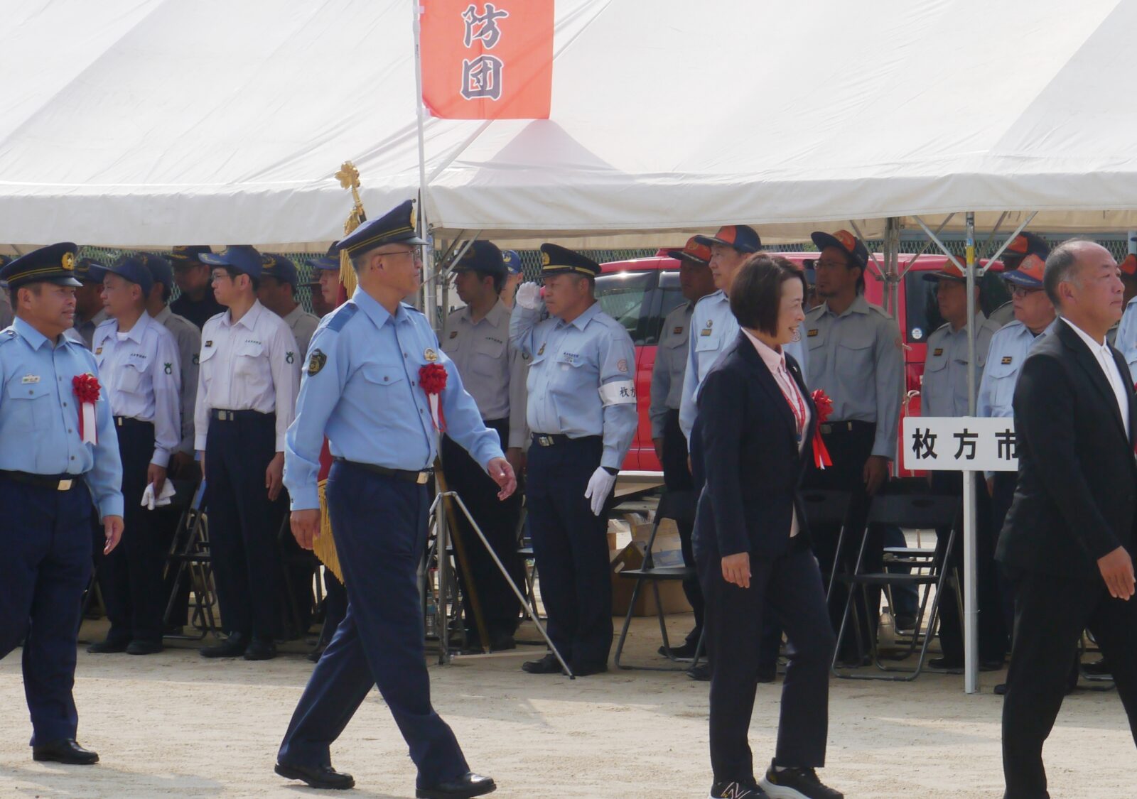 部隊の視閲では、枚方市長 伏見市長がポンプ操法隊・女性消防隊・各市消防団の順に視閲を行いました。