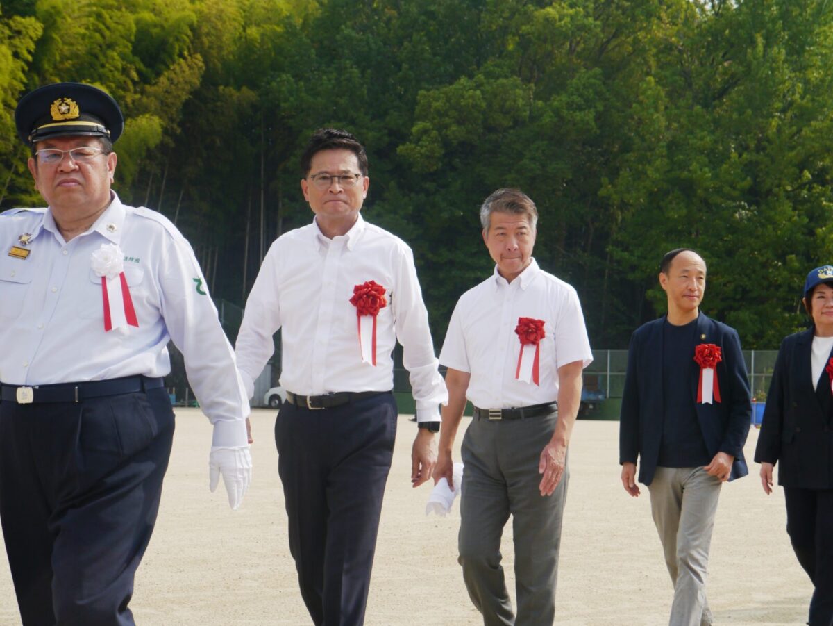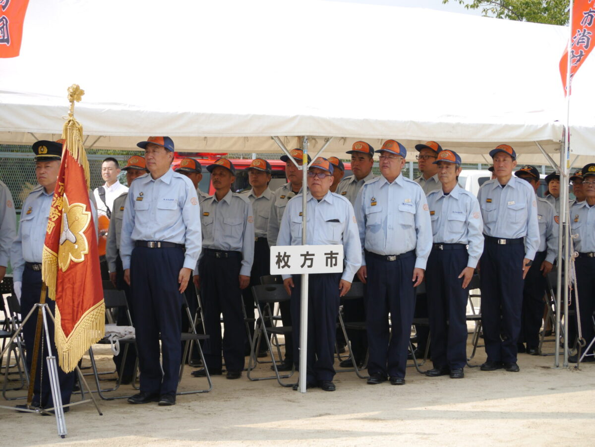 北河内地区支部総合訓練大会の閉会後、枚方消防団は関係者による挨拶の場を設け、枚方市 伏見隆市長をはじめ、枚方市議会 番匠映仁副議長、枚方寝屋川消防組合 伊藤高博消防長より温かいお言葉を頂戴しました。
