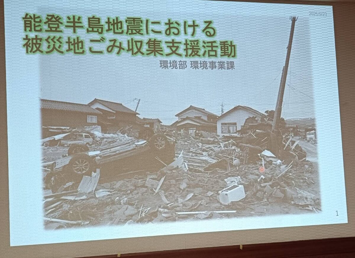 令和7年9月23日(火)枚方市女性分団定期訓練にて、枚方市環境部環境事業課 課長代理 山田さん、危機管理部対策推進課 課長代理 山本さんをお迎えし「能登半島地震における被災地支援活動」「災害ごみ取り扱い」についての講義を受けました。