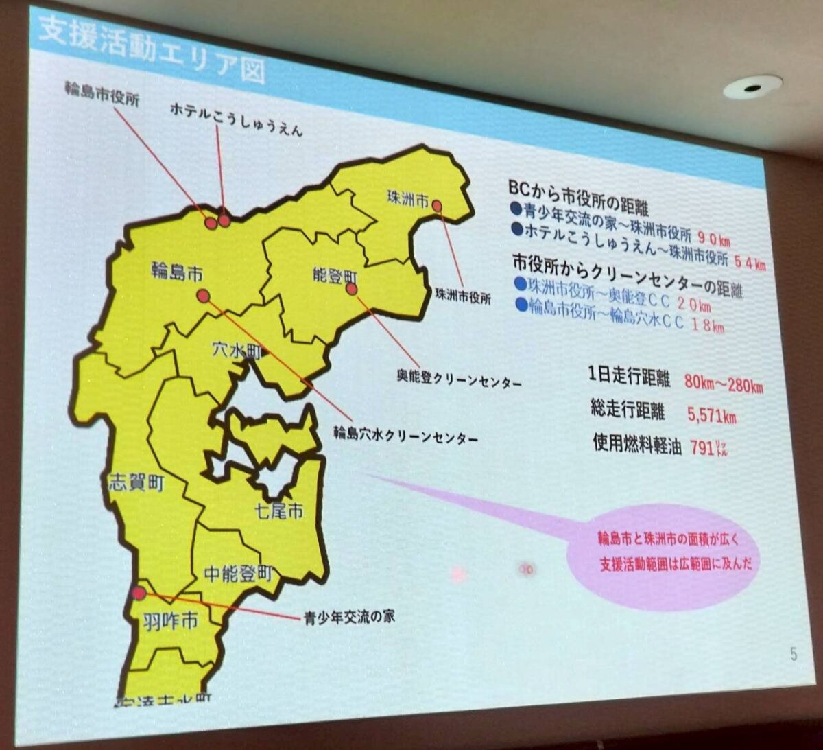 活動地の焼却施設が断水や破損により全面的に機能停止。収集した可燃ごみは、一度集積所で大型トラックに積み替え、約150km離れた金沢市まで長距離搬送(往復約300km)する必要があった。このため運搬は1日に1往復が限界であり、処理能力に大きな制約が生じた。