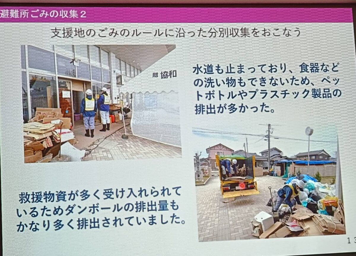 断水により食器が洗えないため、ペットボトルや弁当容器、支援物資の段ボールが大量に排出された。トイレの排泄物は感染症対策のため分別されていたが、保管方法は避難所ごとに異なり、統一されていなかった。