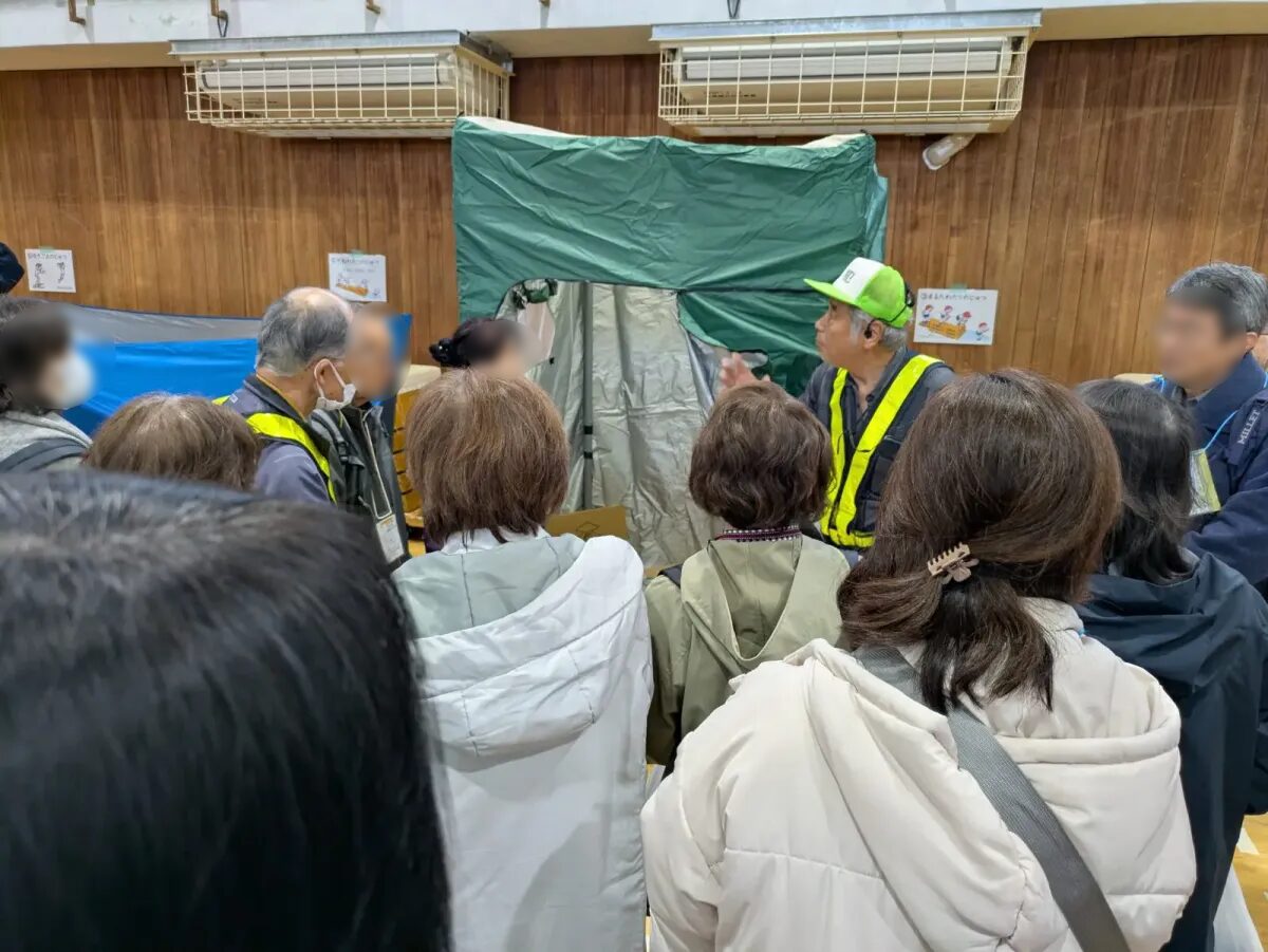 体育館でテント、パーテイション、簡易ベッド、簡易トイレなどの組み立て方や使用方法について確認されました。