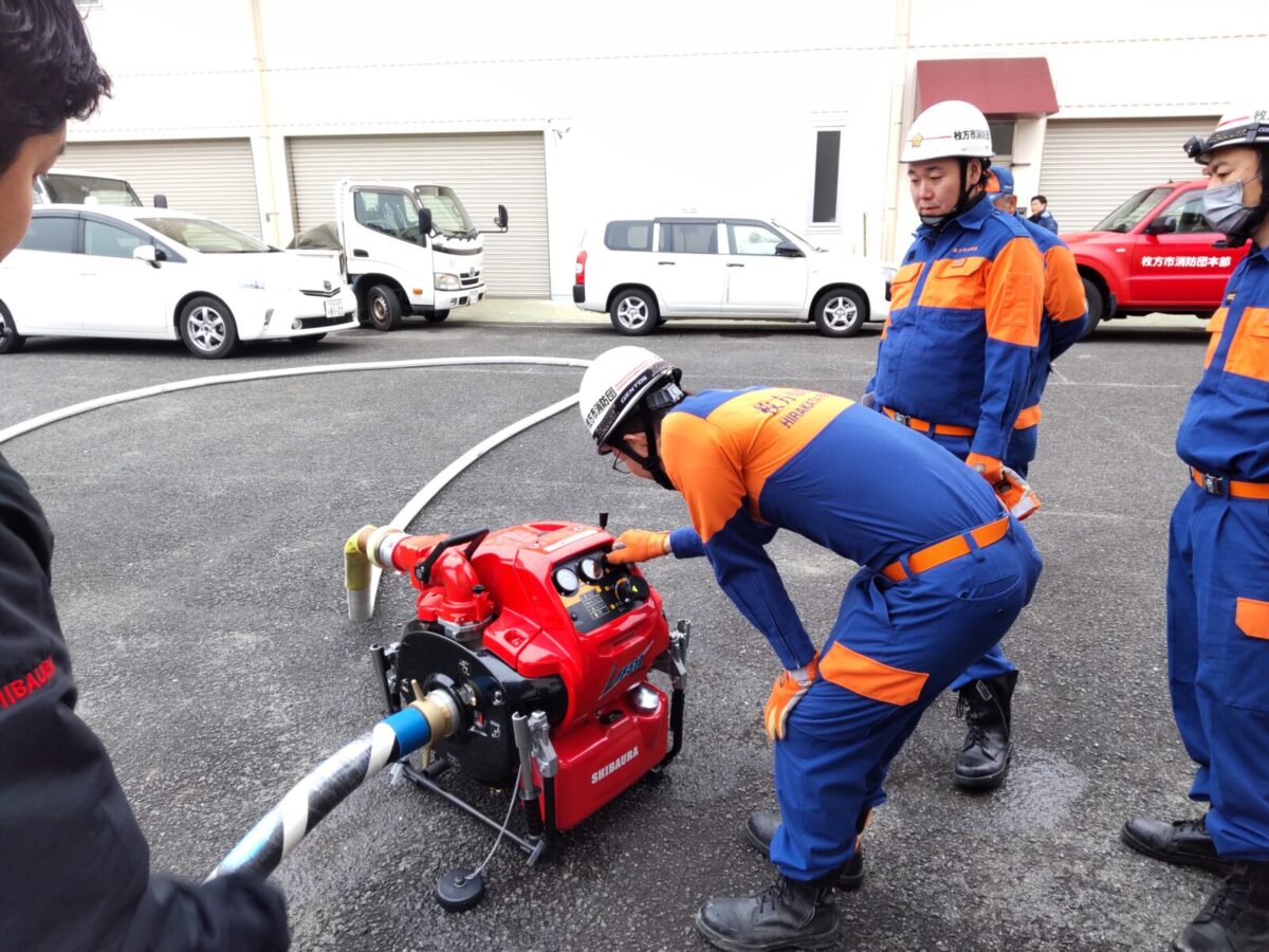 可搬式ポンプは実際に車両から降ろして、始動から放水までの手順を資料も見ながら納入業者の方に説明をしていただきました。説明の後は参加した団員が実際に始動から放水までの動作を行い、各分団で他の団員に説明できるようにました。