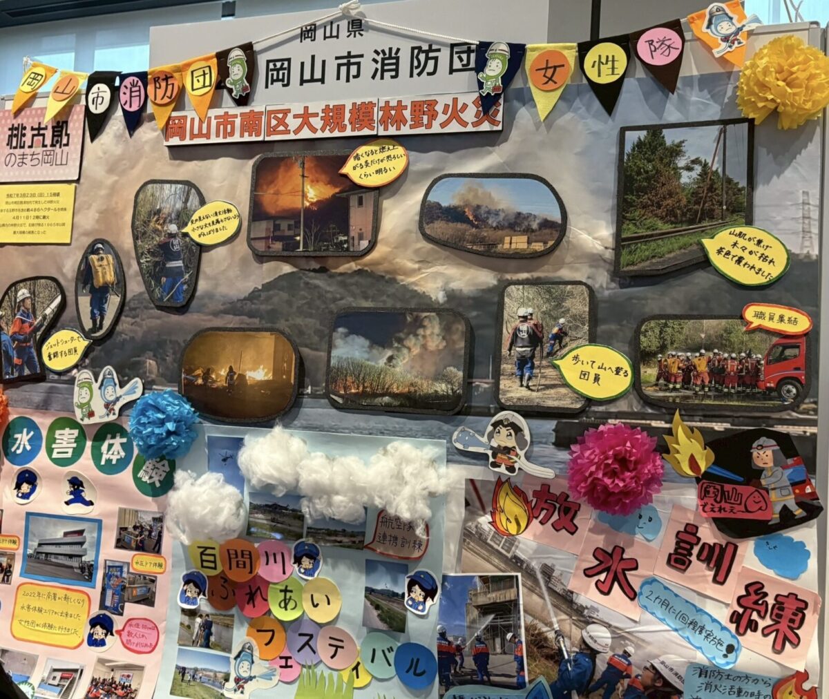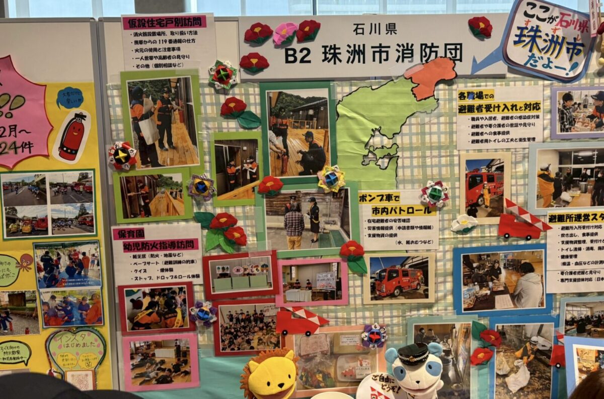 災害があった珠洲市や岡山市の災害後の風景などの写真の展示もあり、有事には消防団員がすぐに駆けつけ、消火や避難のお手伝い、周辺の安全確認、地域の皆さまの安心安全のための活動が見え、気丈に振る舞いながら消防団員としての誇りを持ち活動されておられる展示もありました。