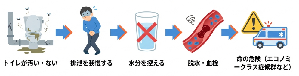 排泄を我慢しようとして水分を控える方が増え、脱水症状や便秘、体調悪化につながり、衛生状態が悪化すれば感染症のリスクも高まります。