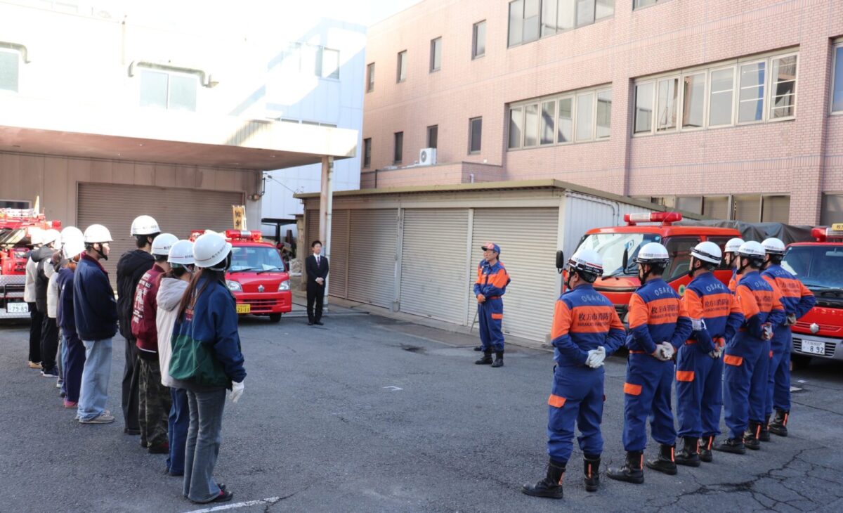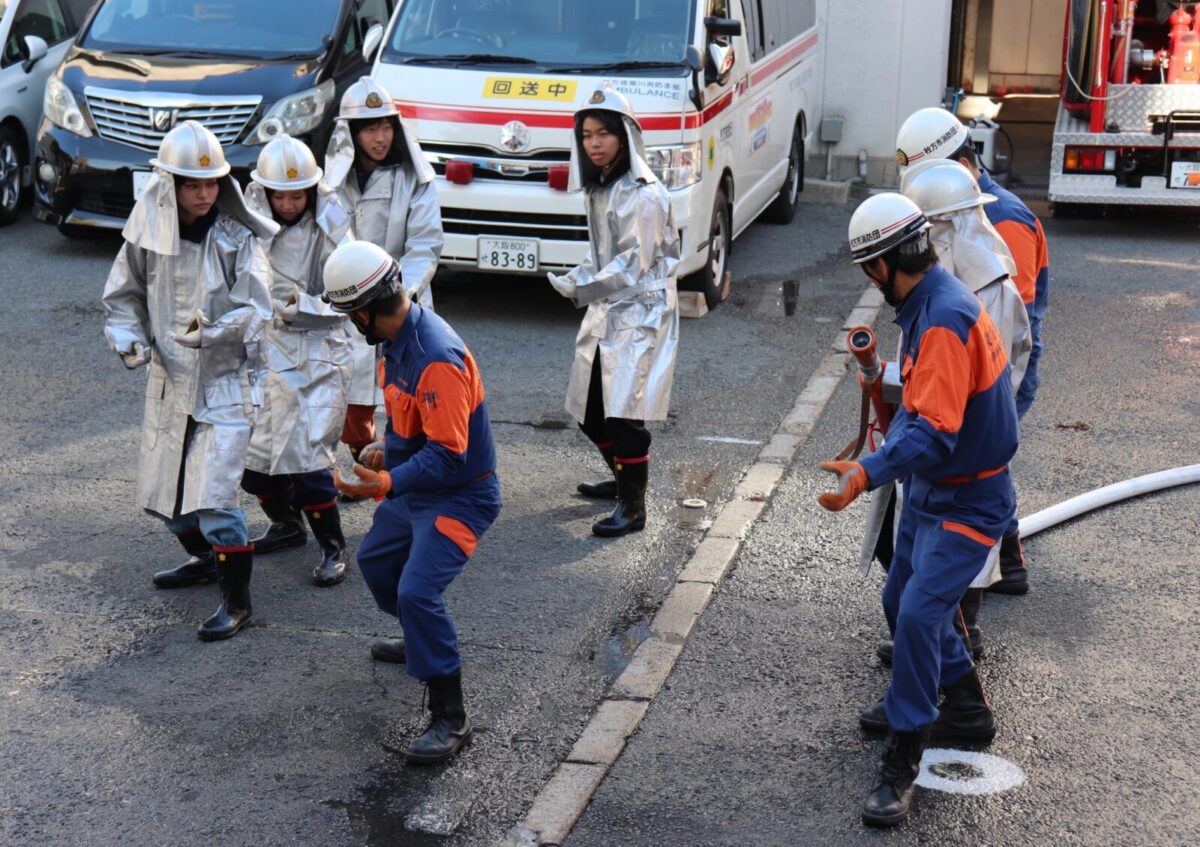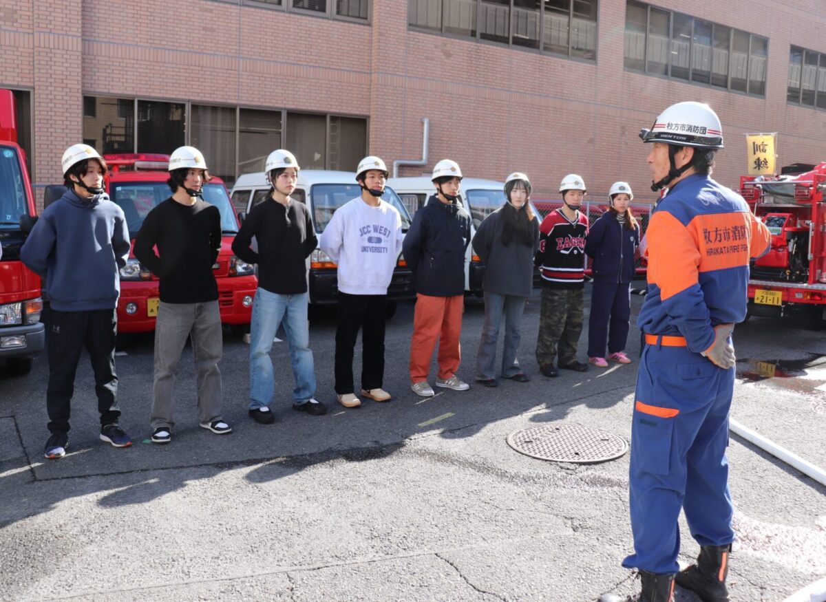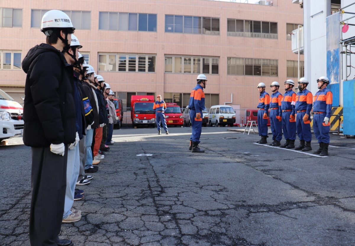枚方市消防団では、令和7年1月18日(日)に枚方寝屋川消防組合枚方消防署において、関西外国語大学のボランティアサークル「WiZ HABITAT(ウィズハビタット)」に所属する学生の皆さんによる消防団体験会を実施しました。