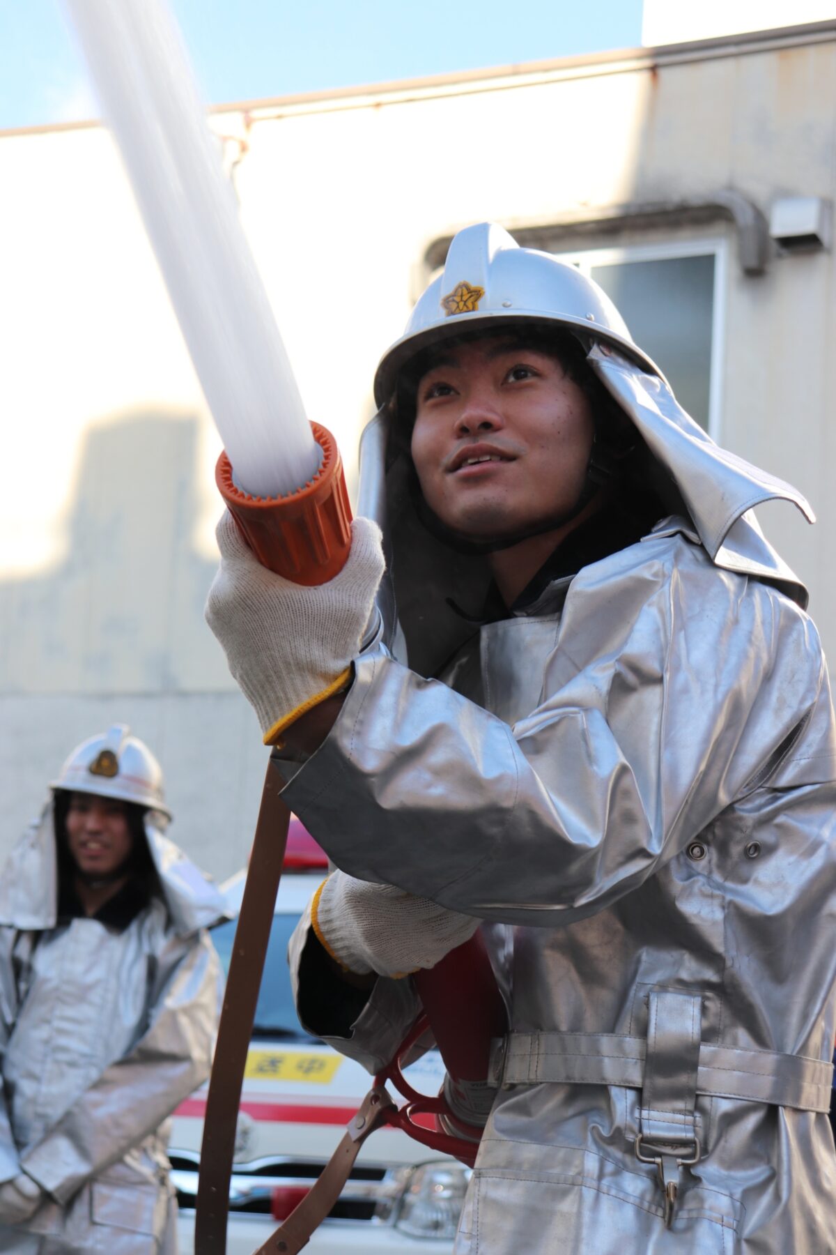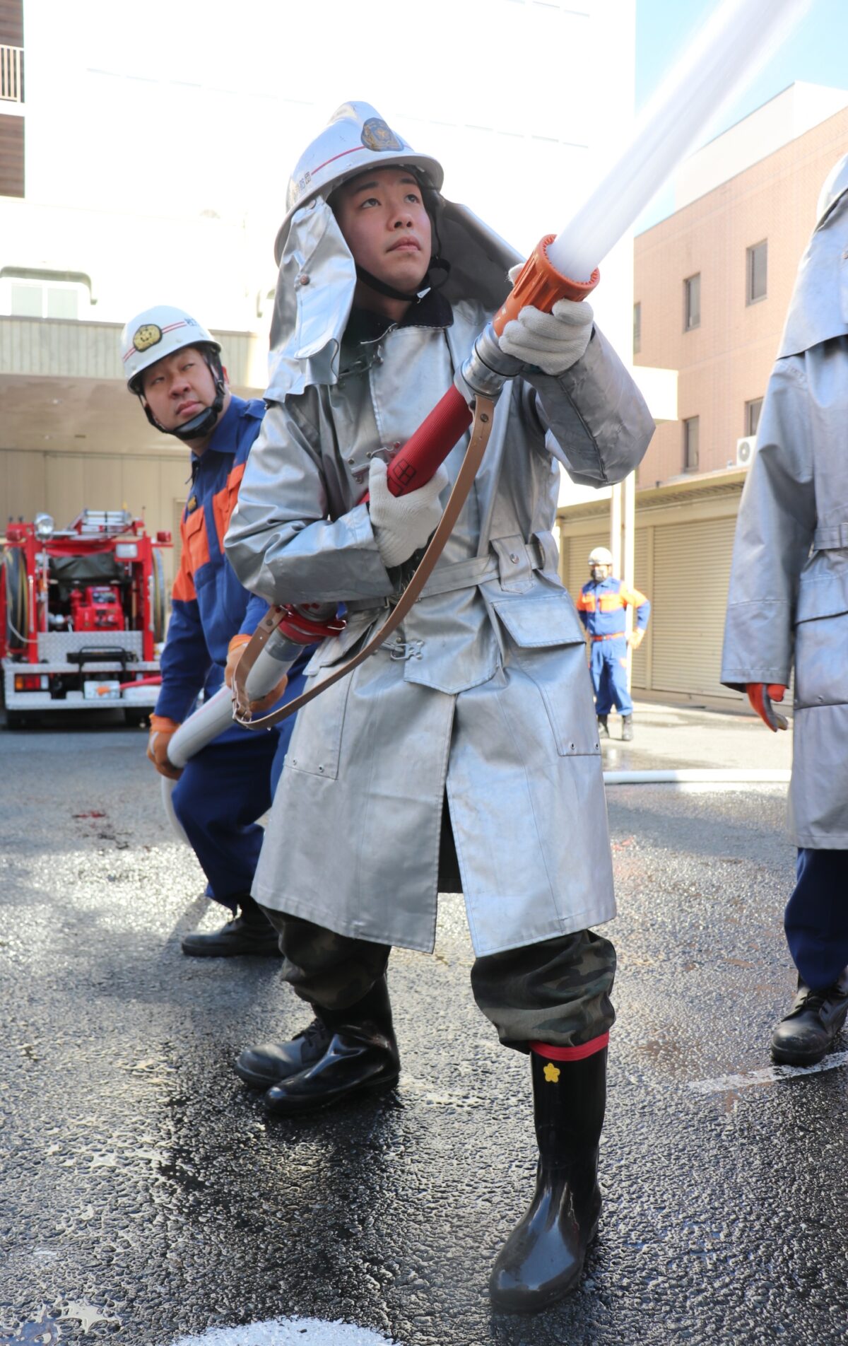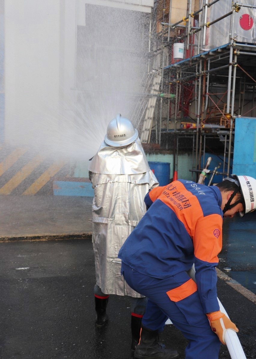 思った以上に硬くて重く動きにくいという感想もありましたが、炎や水から消防団員を守るためという説明に納得します。