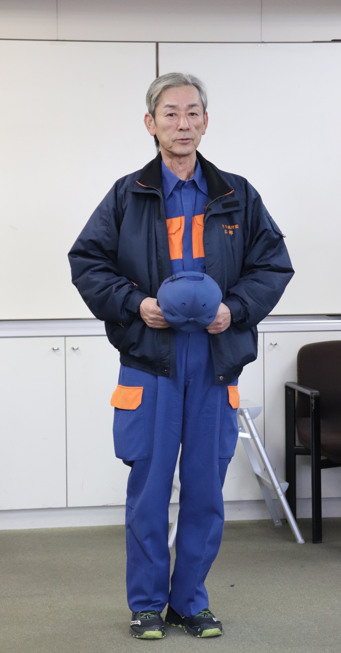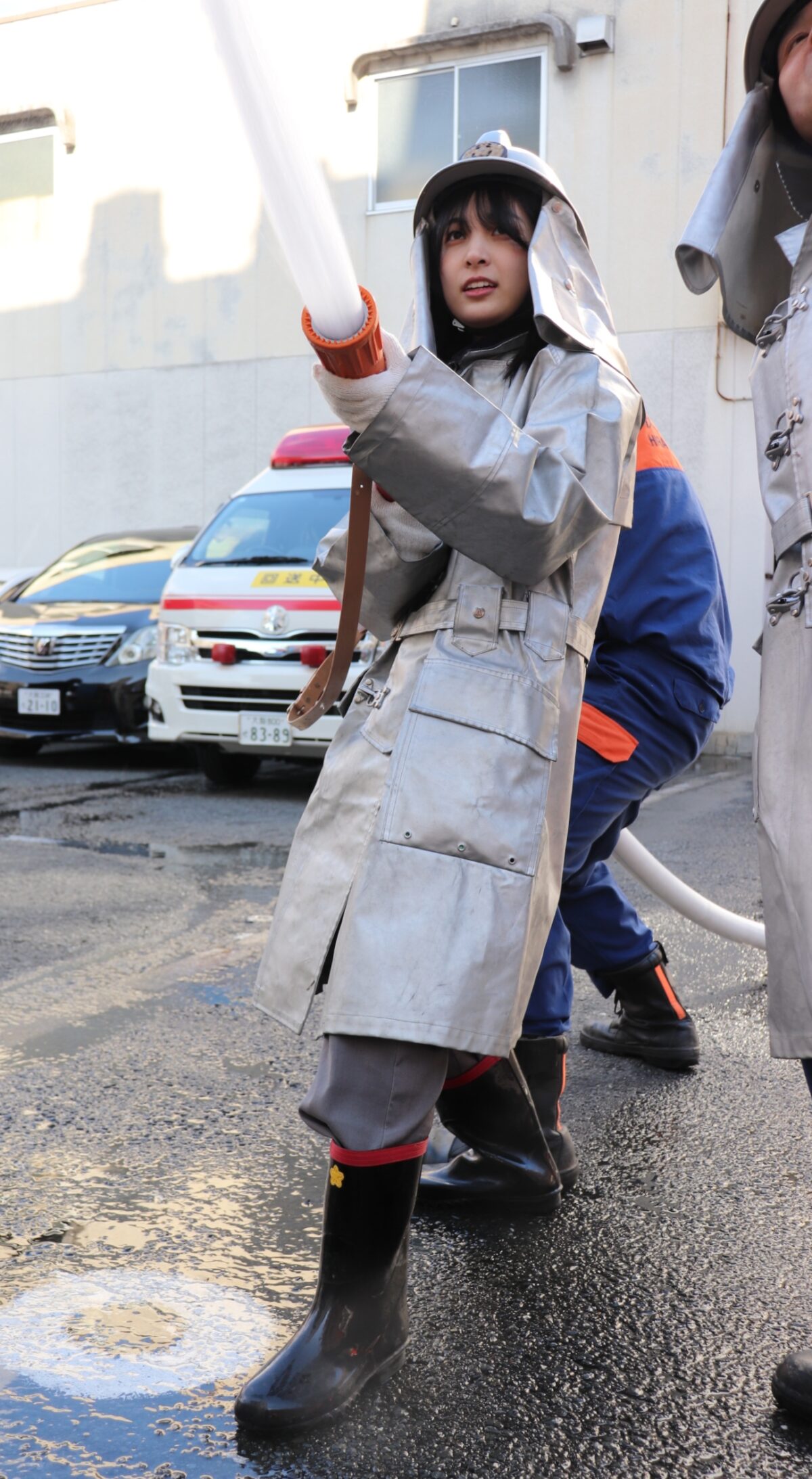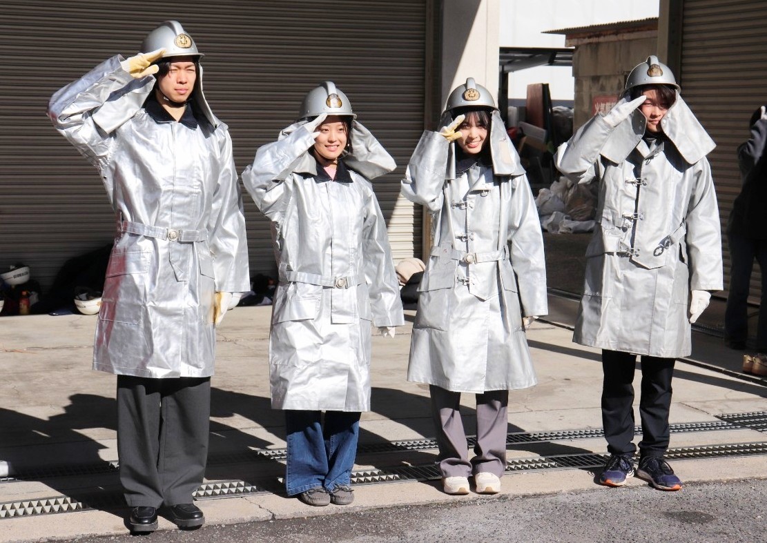 思った以上に硬くて重く動きにくいという感想もありましたが、炎や水から消防団員を守るためという説明に納得します。