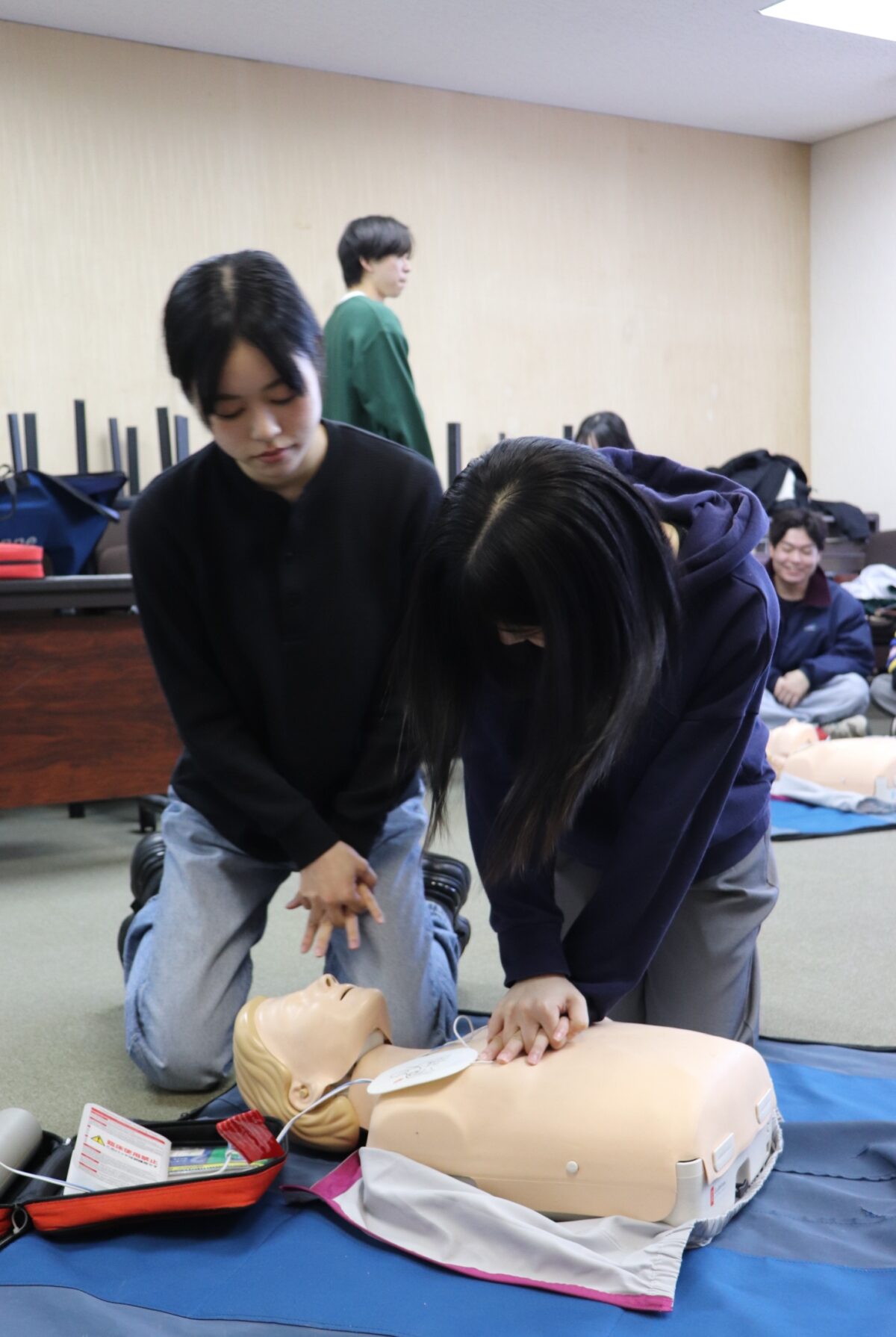 直接「いのち」にかかわる大切な事であり、学生の皆さんは一次救命処置の重要性をよく理解された上での受講ですので真剣そのもの、会場に引き締まった空気が流れます。