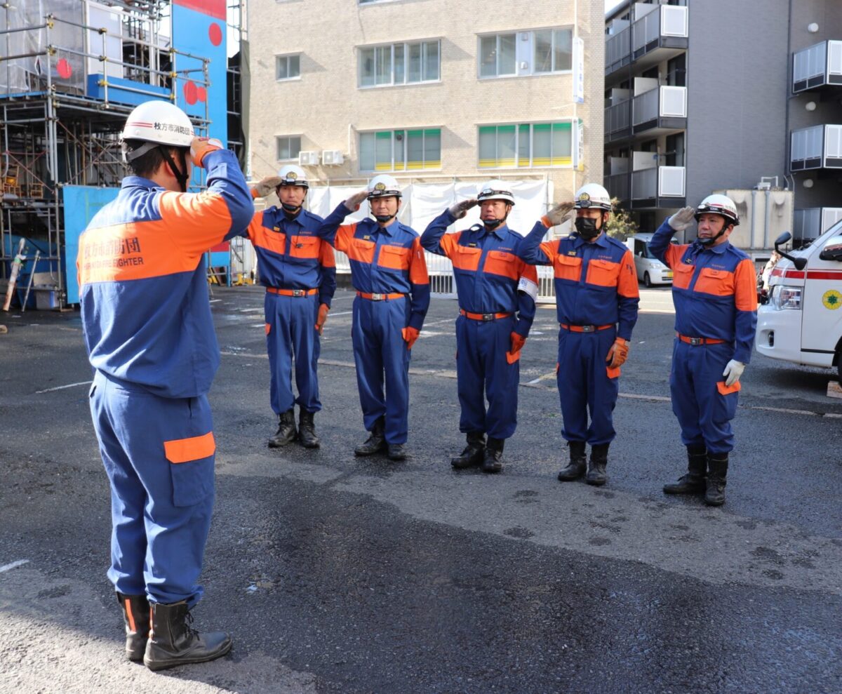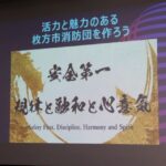 そして今、運営に向けて取り組んでいる「機能別消防団員」の機能を有する組織づくりを目指し、更なる地域防災力の向上と地域社会との連携強化に努め、安全・安心で住みよい街づくりに貢献出来る様、枚方市消防団は一丸となって取り組んでまいります。