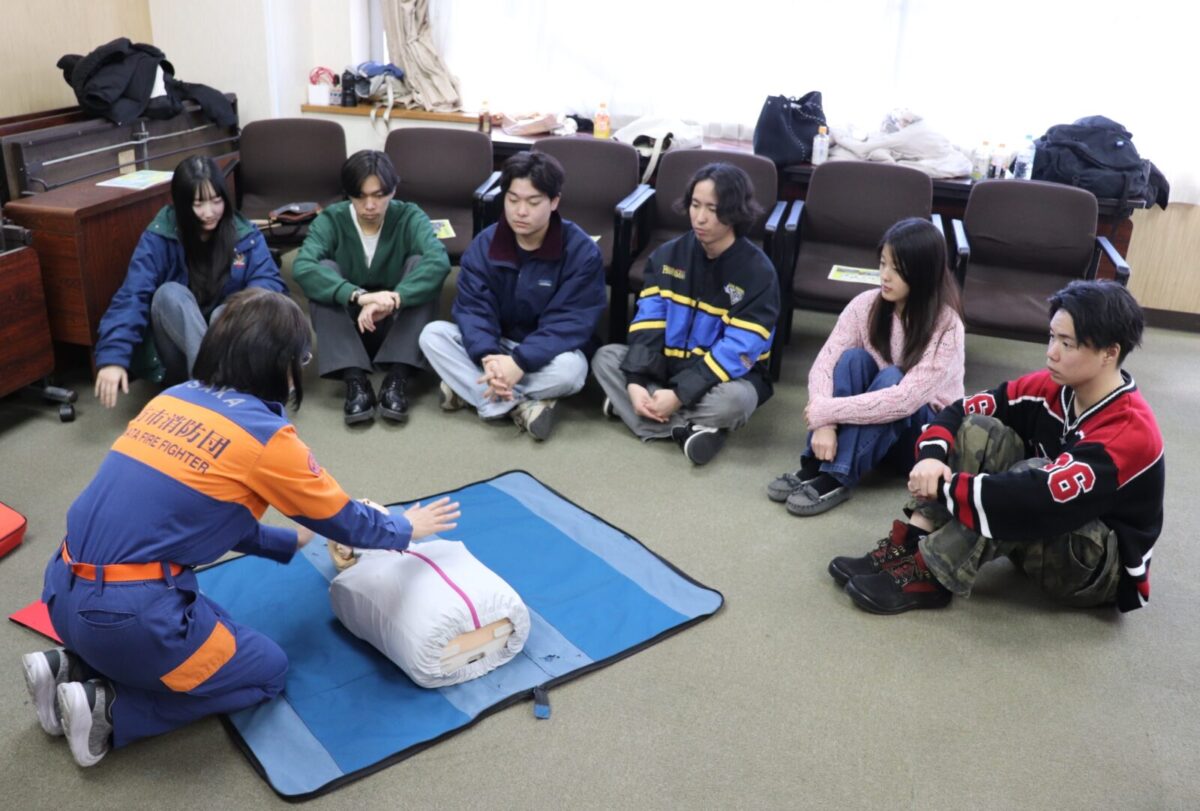 また広報部からは、同校同サークルに所属する子女を持つ団員も派遣し、学生の皆さんと消防団員が気軽に近い位置でコミュニケーションを図れる様に準備を行いました。