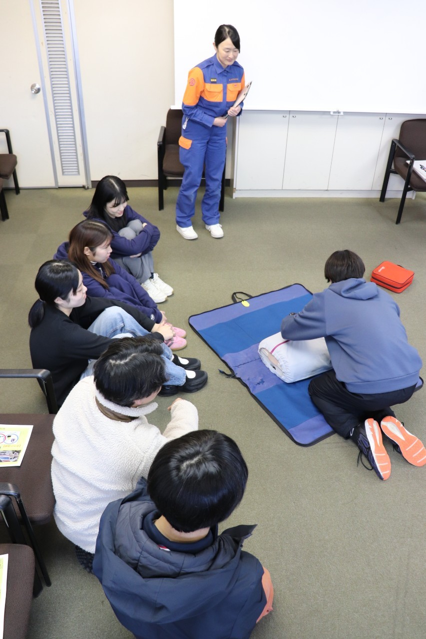 AED(自動体外式除細動器)の操作方や心肺蘇生法の効果測定が終われば、人体から出血が認められた場合に行う「止血法」や喉に異物が閉そくした際に行う「異物除去法」の解説も行いました。