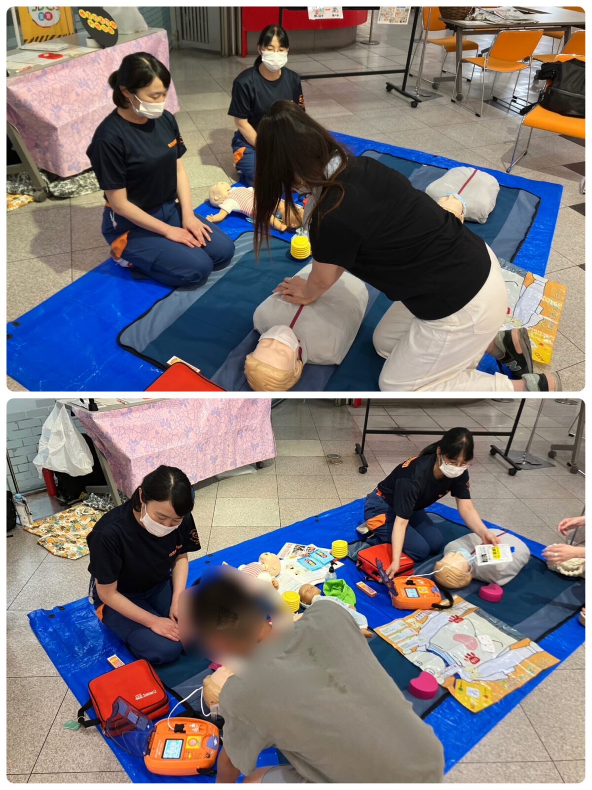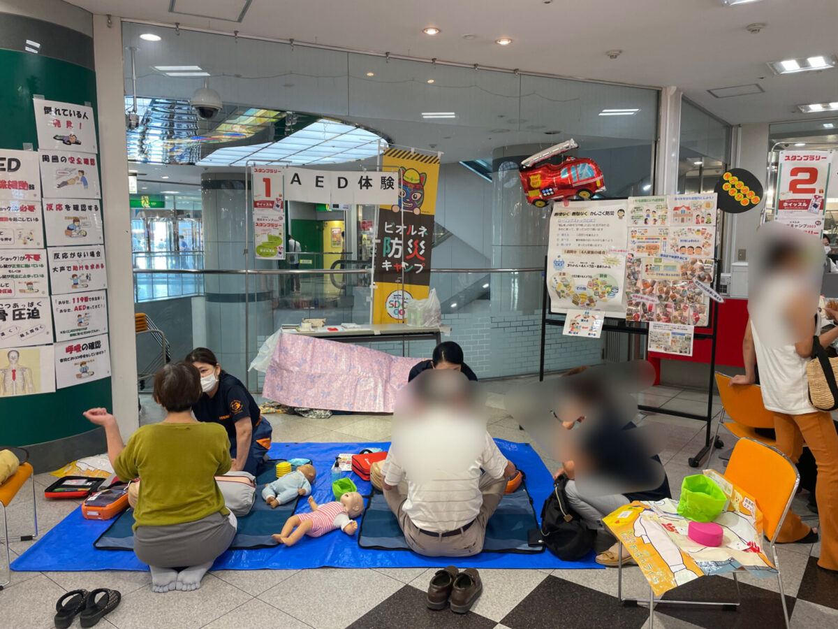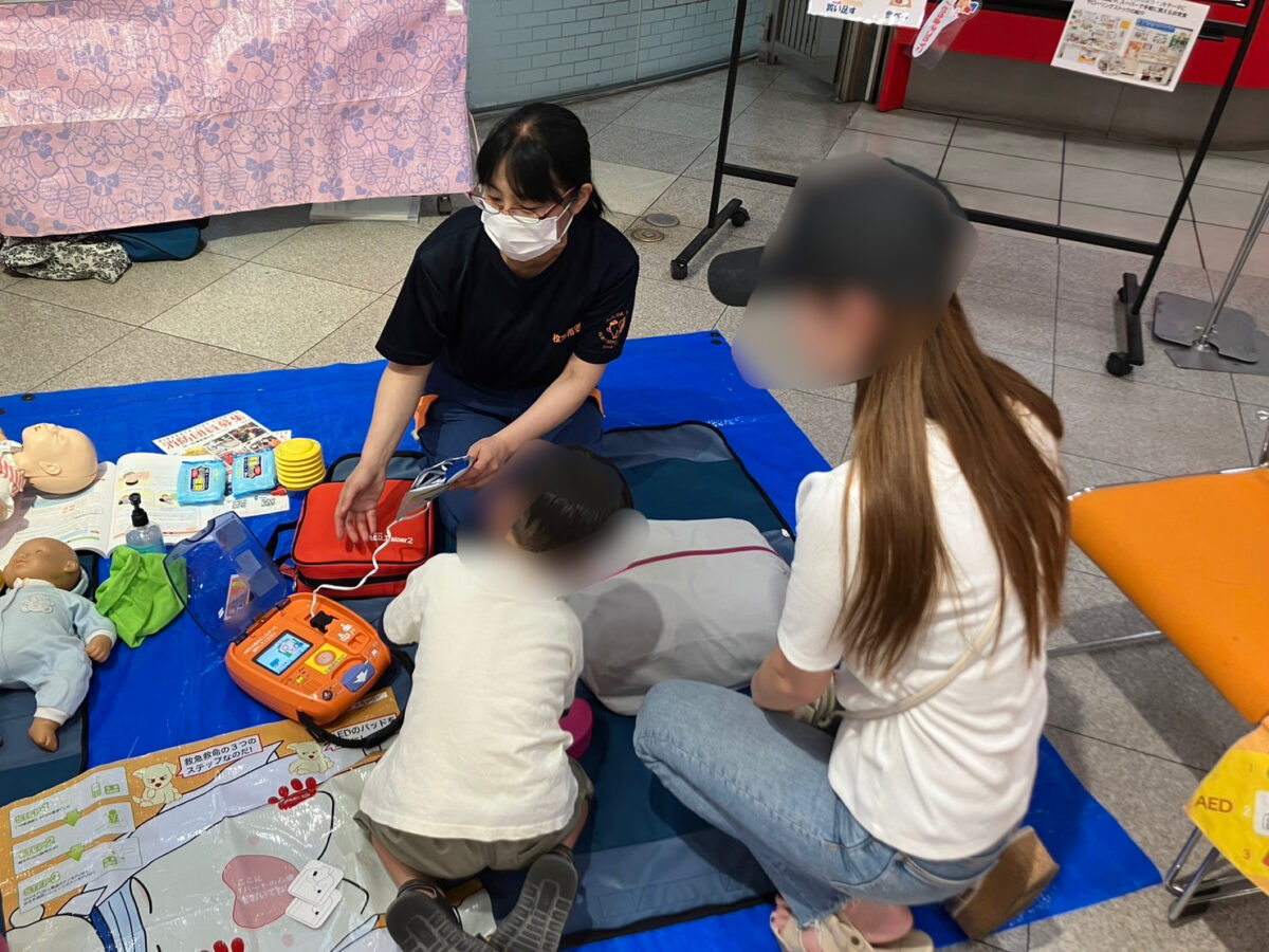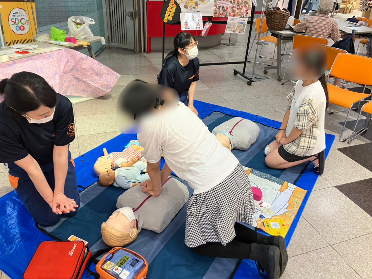 心肺蘇生訓練用の人形や、あっぱくん(心肺蘇生トレーニングツール)を使った心肺蘇生・AED(自動体外式除細動器)の使用を体験するコーナーを女性分団が担当させて頂き、今回で4回目の参加となりました。