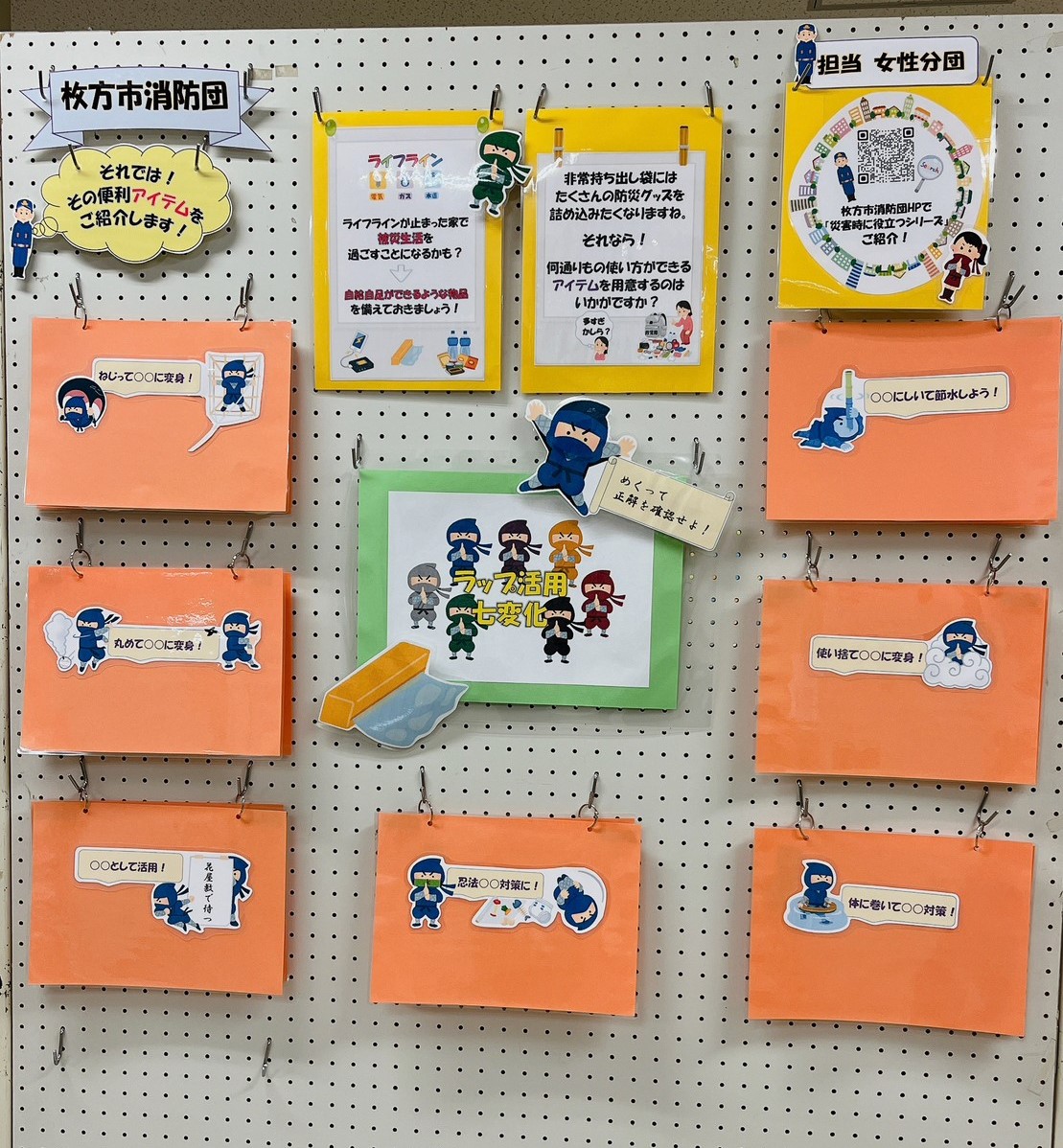 市民の皆さまが身近に防災を考えるきっかけになることを願い、枚方市消防団「女性分団」が担当している防災展示。