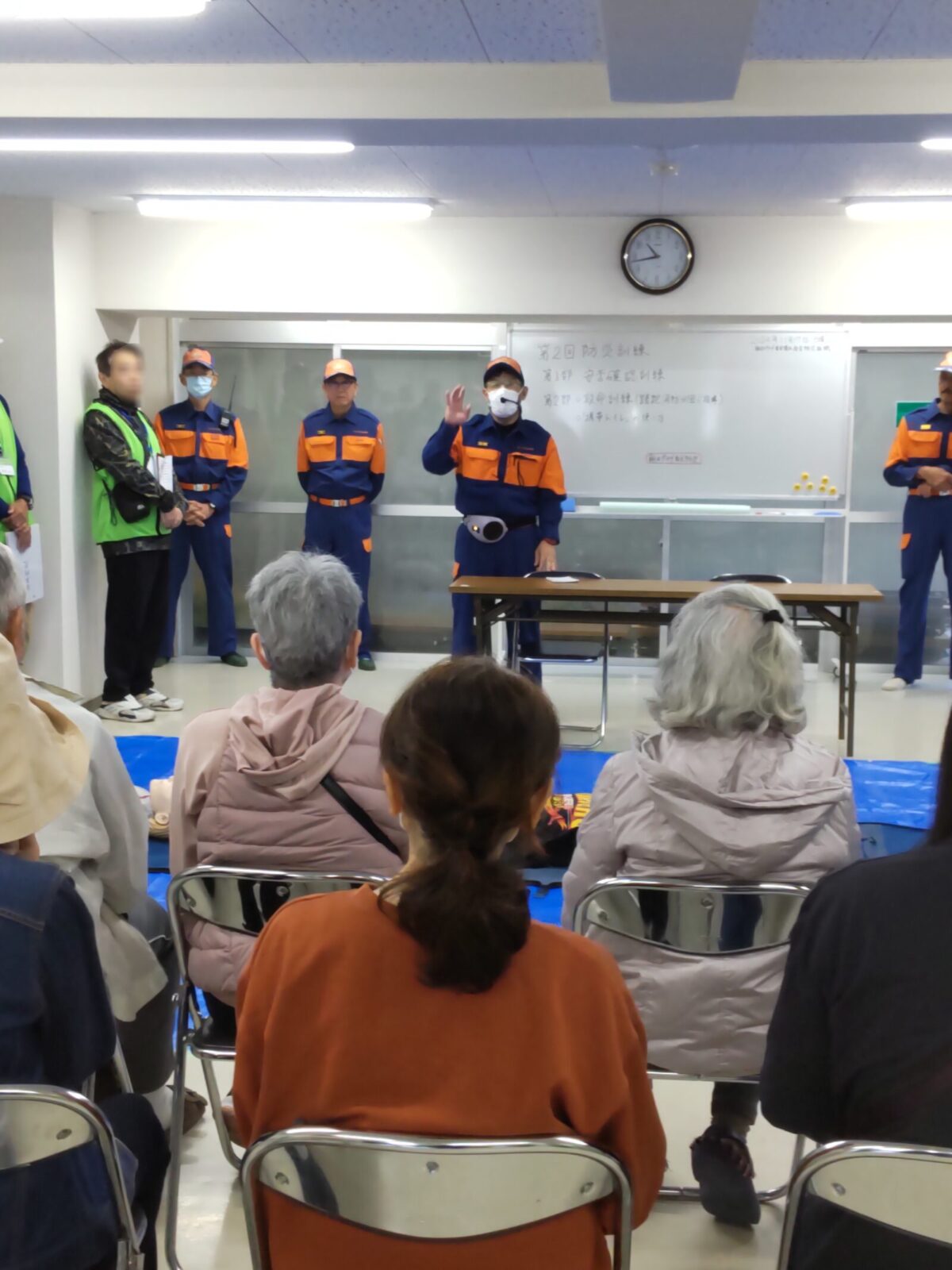 講習の開始後、蹉跎分団の砂山団員が参加者の皆さん「119番をして救急車が到着するまでに何分かかると思いますか?」と質問を行いました。