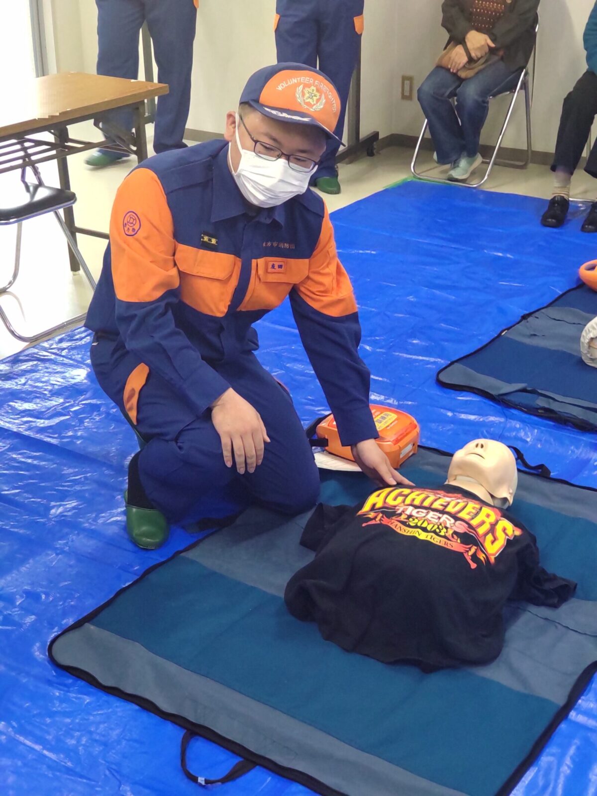 はじめて胸骨圧迫をされる方もおられ、胸骨圧迫をする際の姿勢や手の組み方、位置を説明したり、どれぐらいの強さでやれば良いのか、その他に質問がある方にはお聞きしてお答えをしながら、体の深さ5cmを押す感覚を人形から出る音から感じながら、押すリズムもつかんで頂きました。