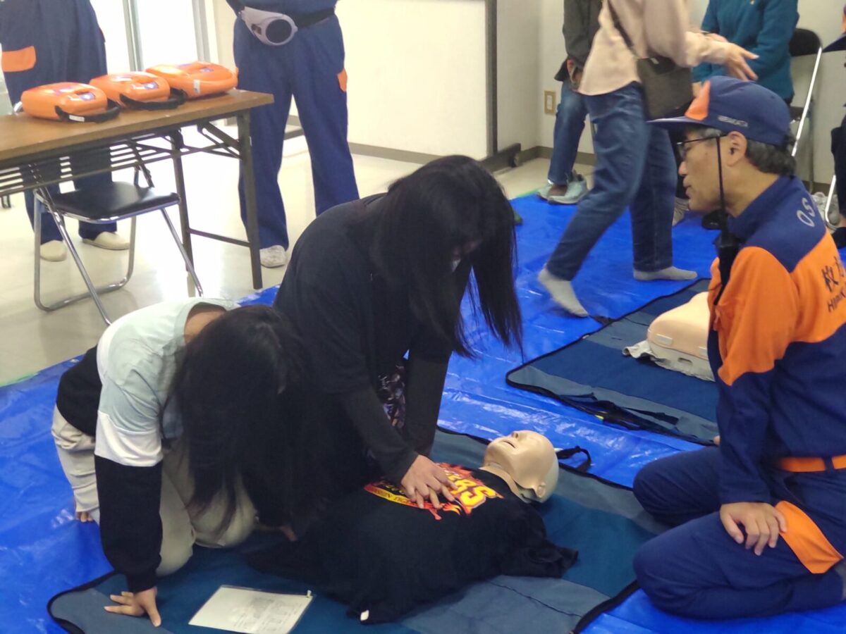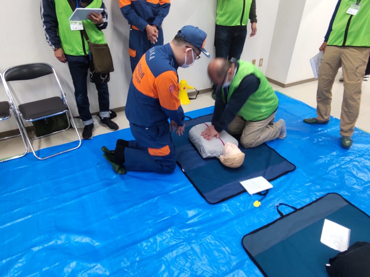 今回は訓練用人形を使用して胸骨圧迫を行う事を中心に皆さんに体験して頂きました。