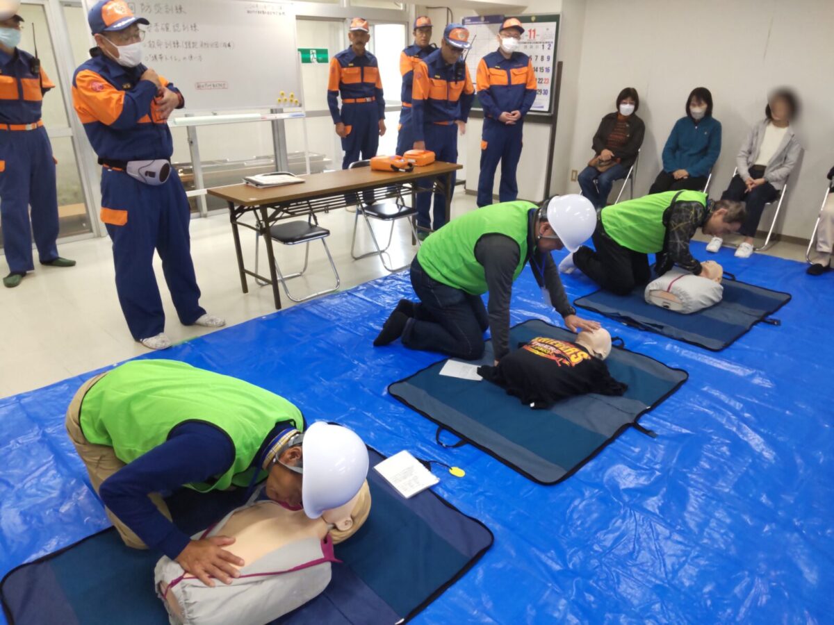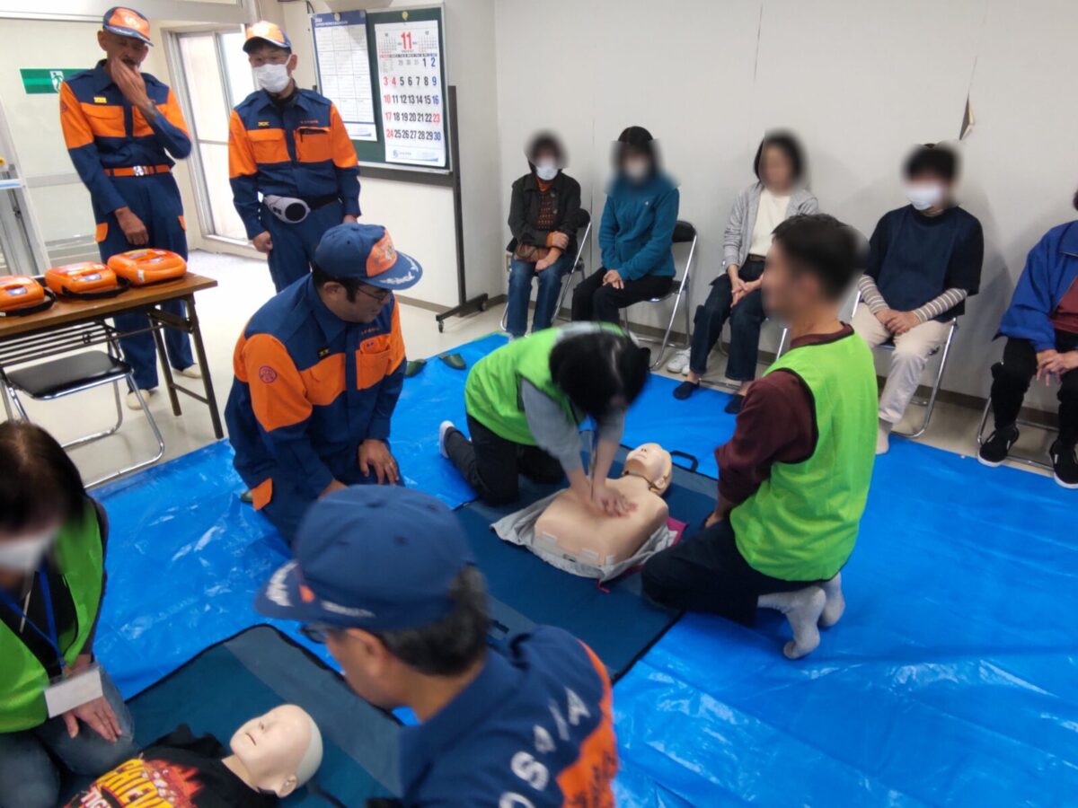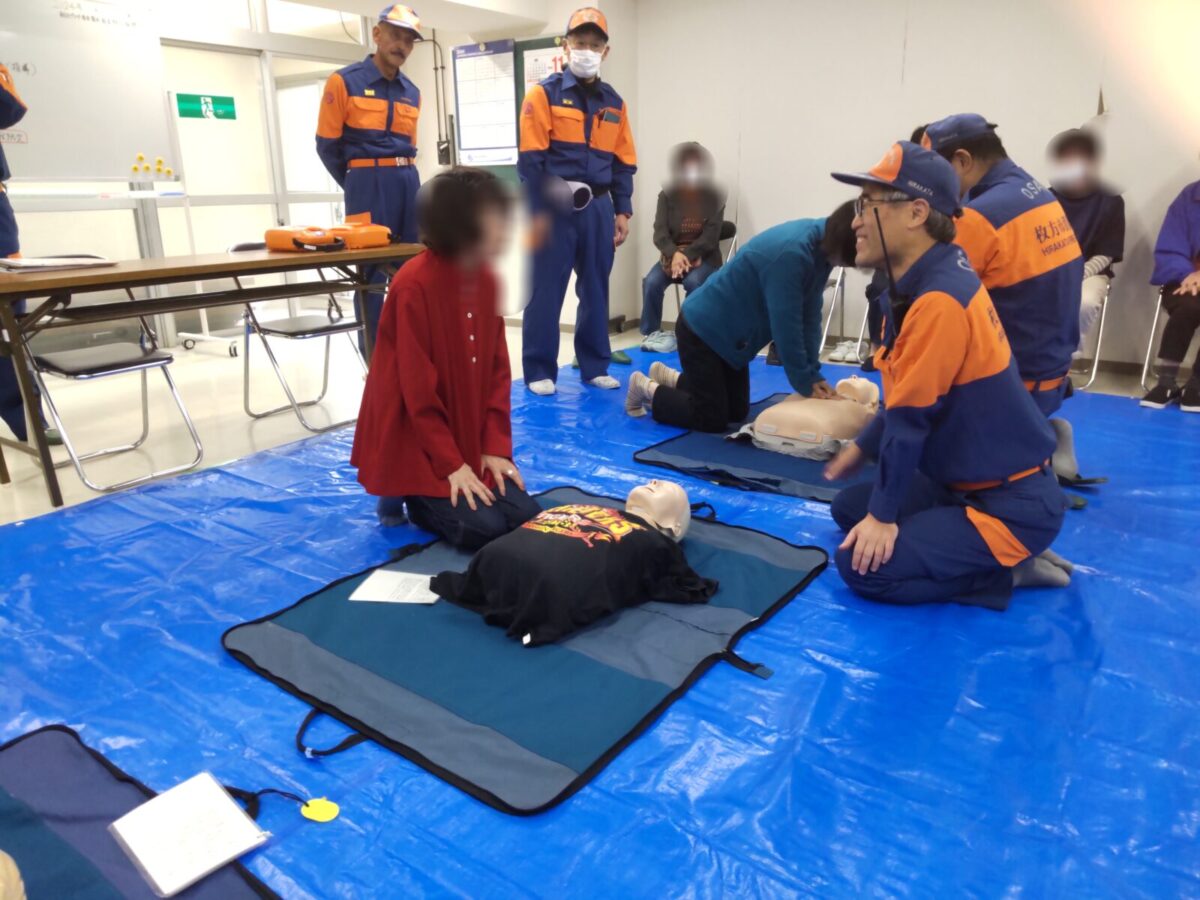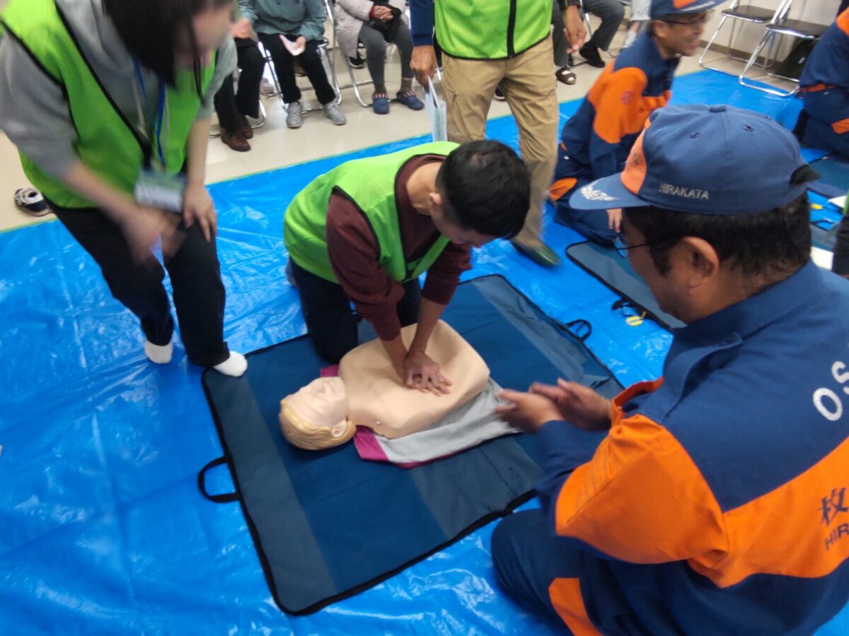 令和6年11月17日(日)枚方市菊丘町の朝日プラザ香里菊丘で、住民の方を対象にした応急手当講習会を行い、蹉跎分団の応急手当普及員の資格を持つ団員が参加しました。