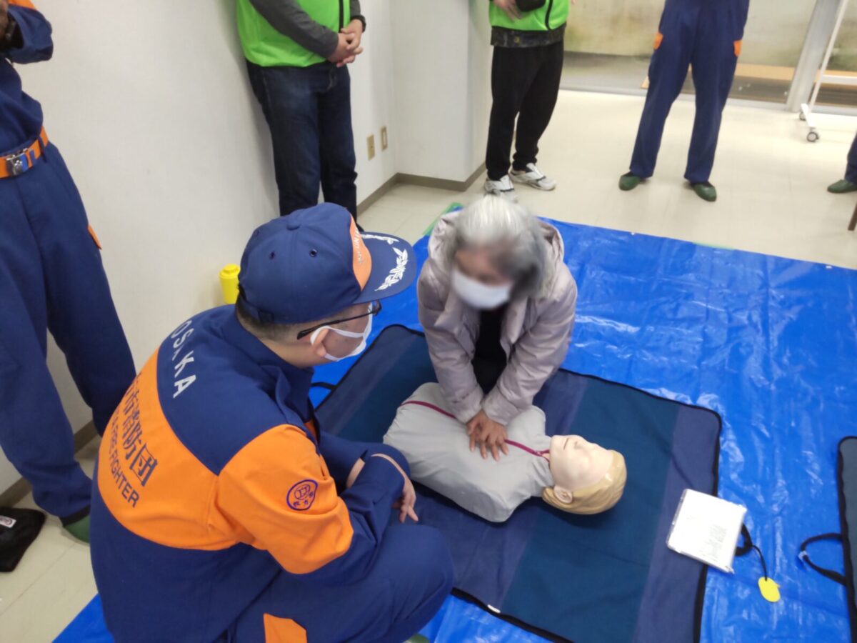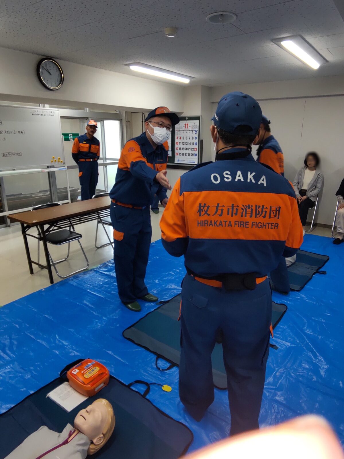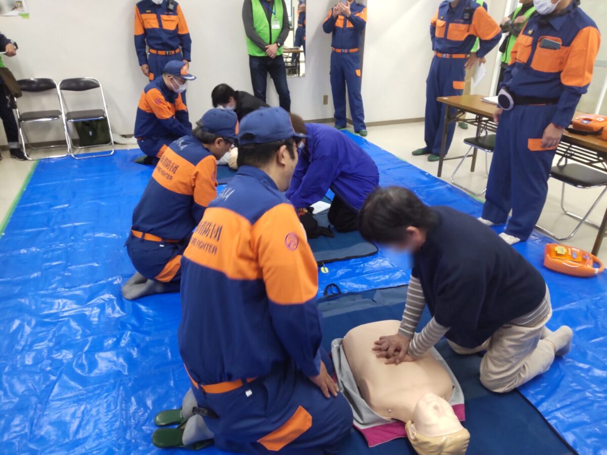 令和6年11月17日(日)枚方市菊丘町の朝日プラザ香里菊丘で、住民の方を対象にした応急手当講習会を行い、蹉跎分団の応急手当普及員の資格を持つ団員が参加しました。