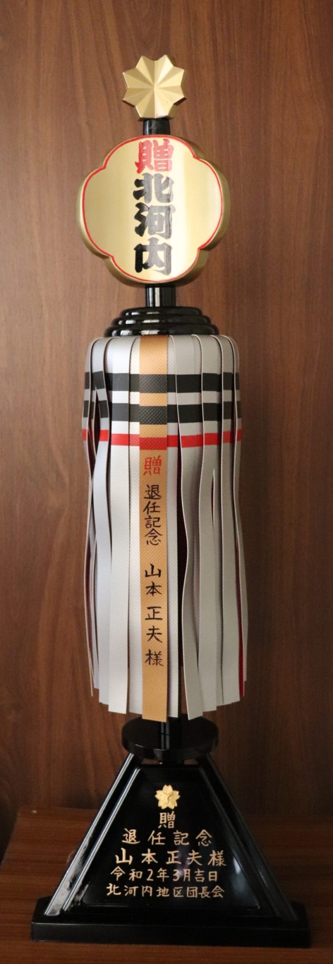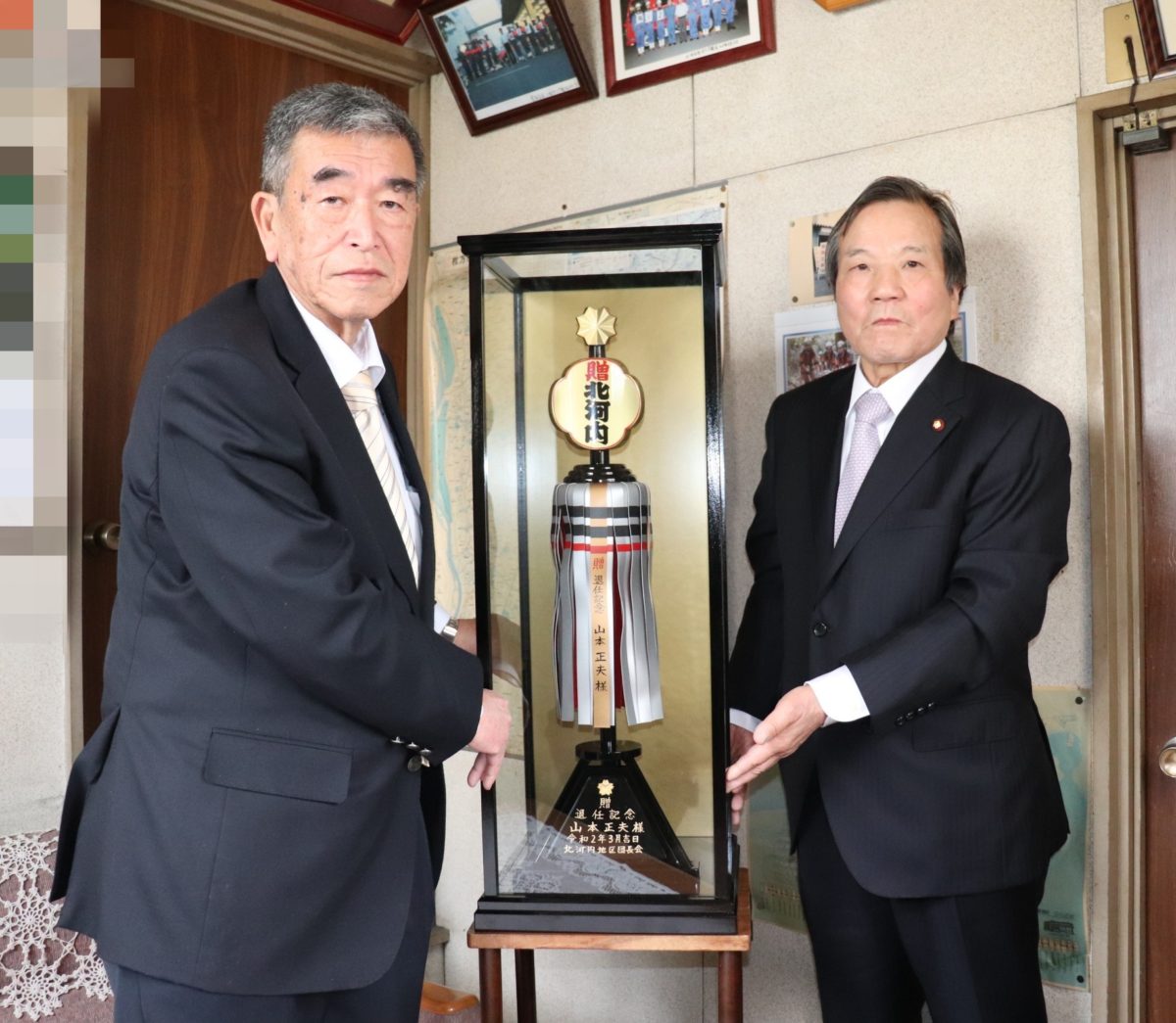 令和2年4月吉日、枚方市消防団を令和2年3月末日をもって勇退されました、第8代枚方市消防団長 山本正夫さんへ大阪府消防協会 北河内地区団長会「纏い会」より長年の消防団活動における数多くの功績を讃え、退任記念品の贈呈が行われました。