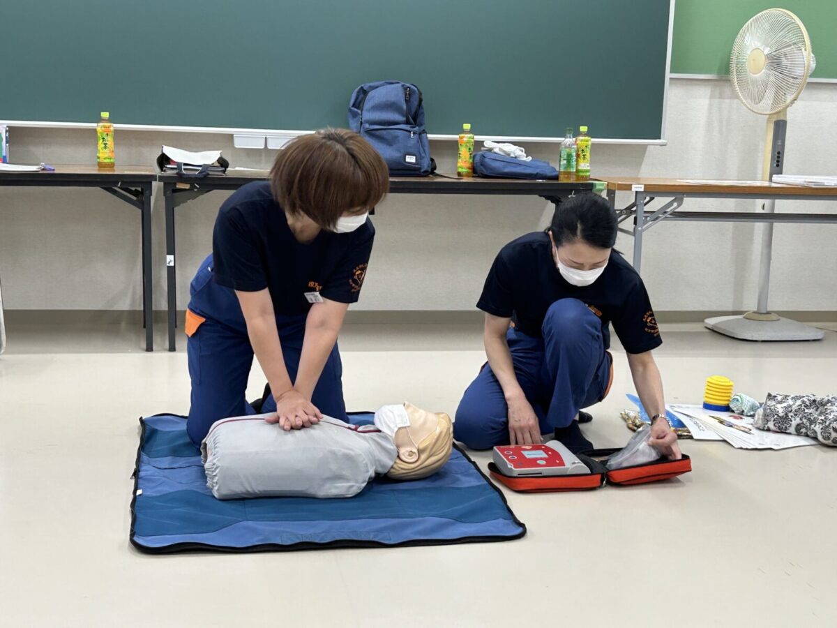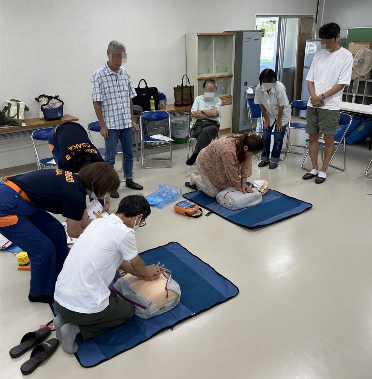 枚方市禁野(旧高陵)校区自主防災会の役員の方に向け、AED(自動体外式除細動器)を使用した救命講習会を行いました。