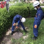 津田分団では、防火水槽の点検・整備を行う際、重量のある鋳鉄製マンホール蓋の取扱いには特に細心の注意を払い、身体の一部をはさむ等のケガをする事がない様、安全作業にも留意しております。