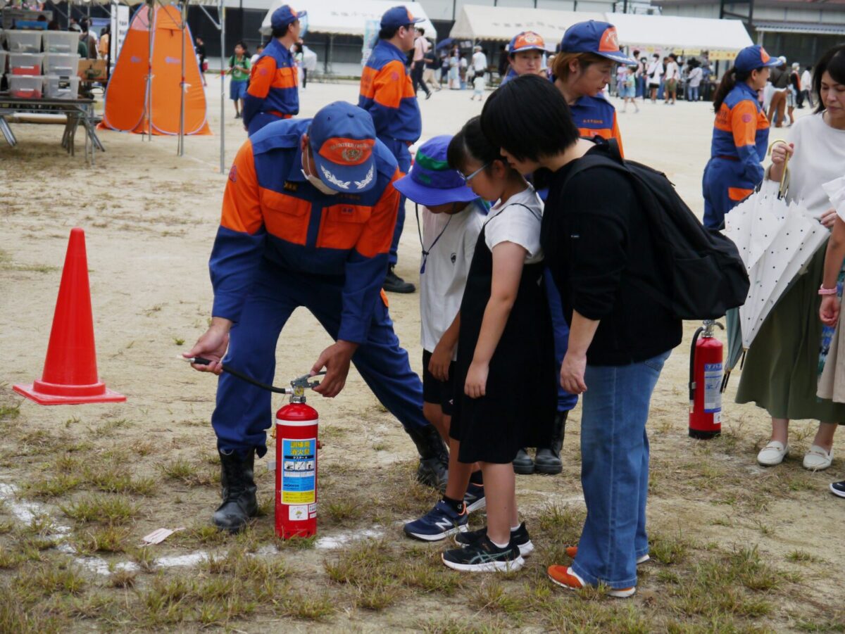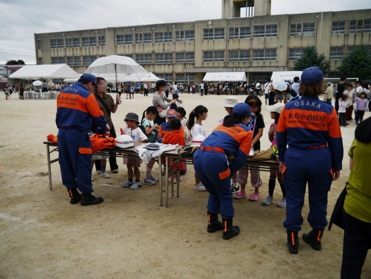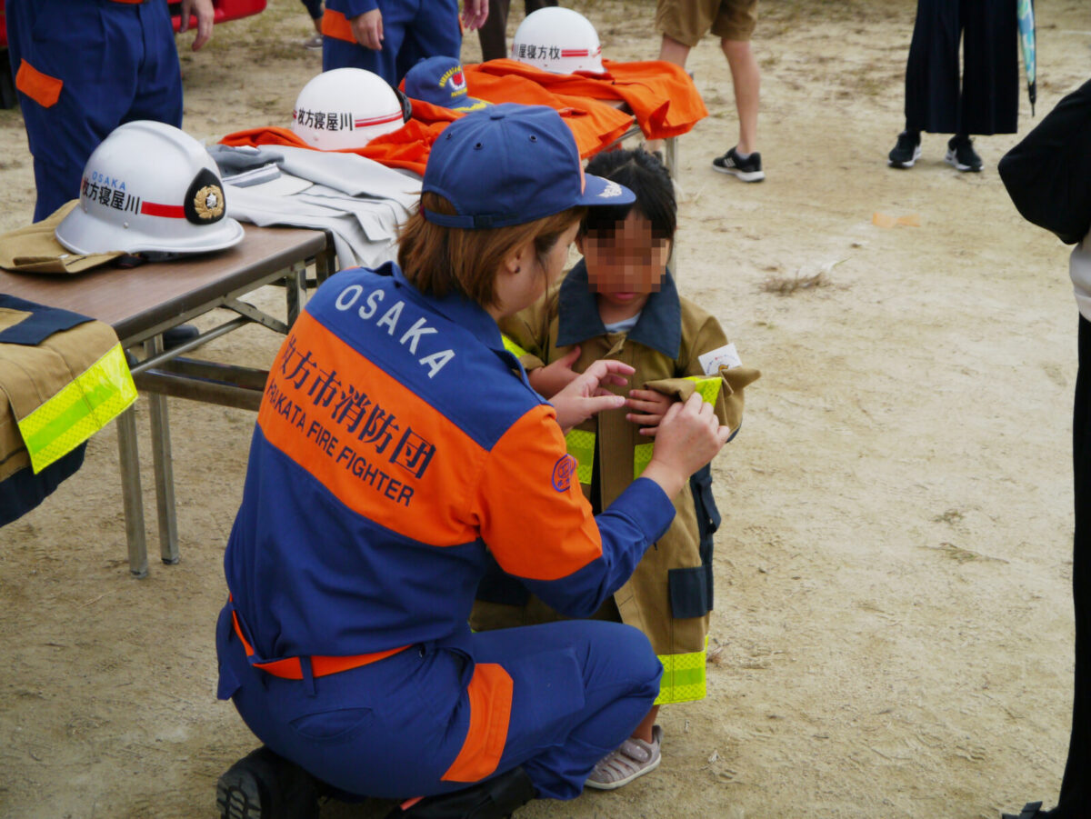 今回16の出店・出展の中、枚方市消防団は子供用消防服を用意し、記念撮影ができるコーナーと水消火器による消火器体験コーナーを担当しました。