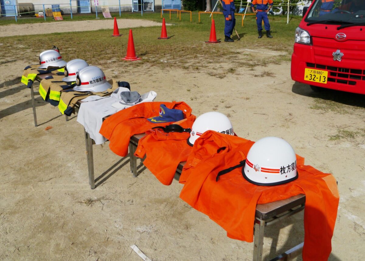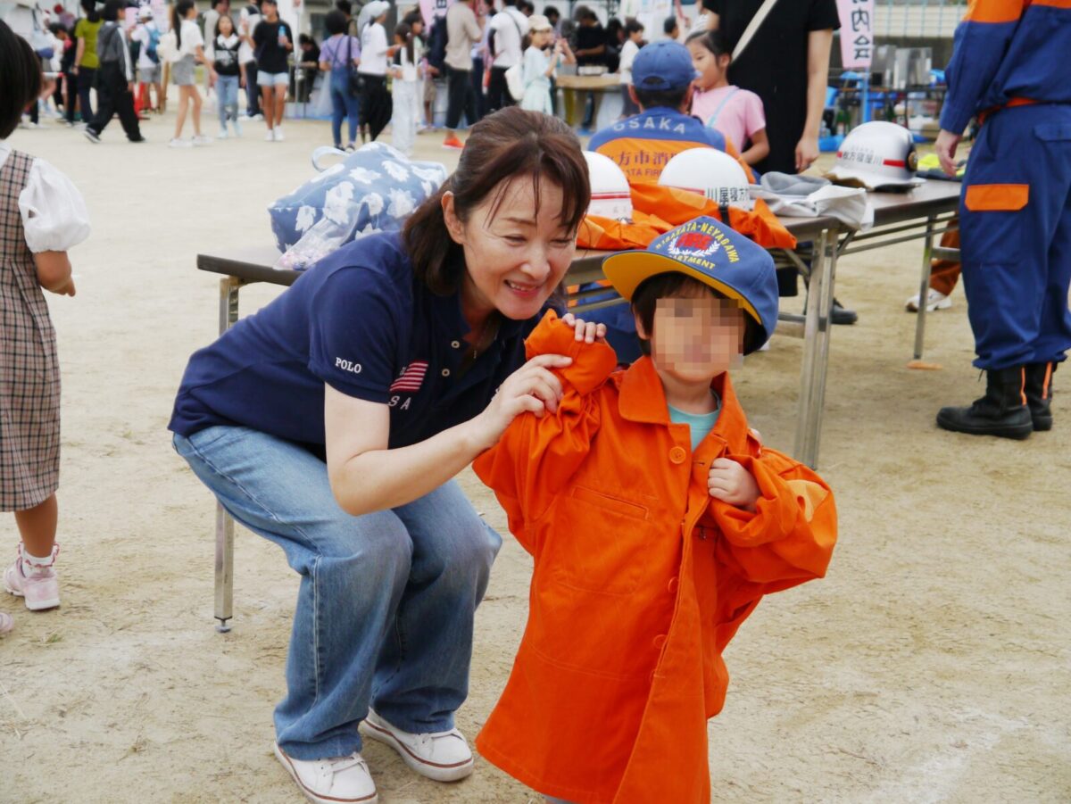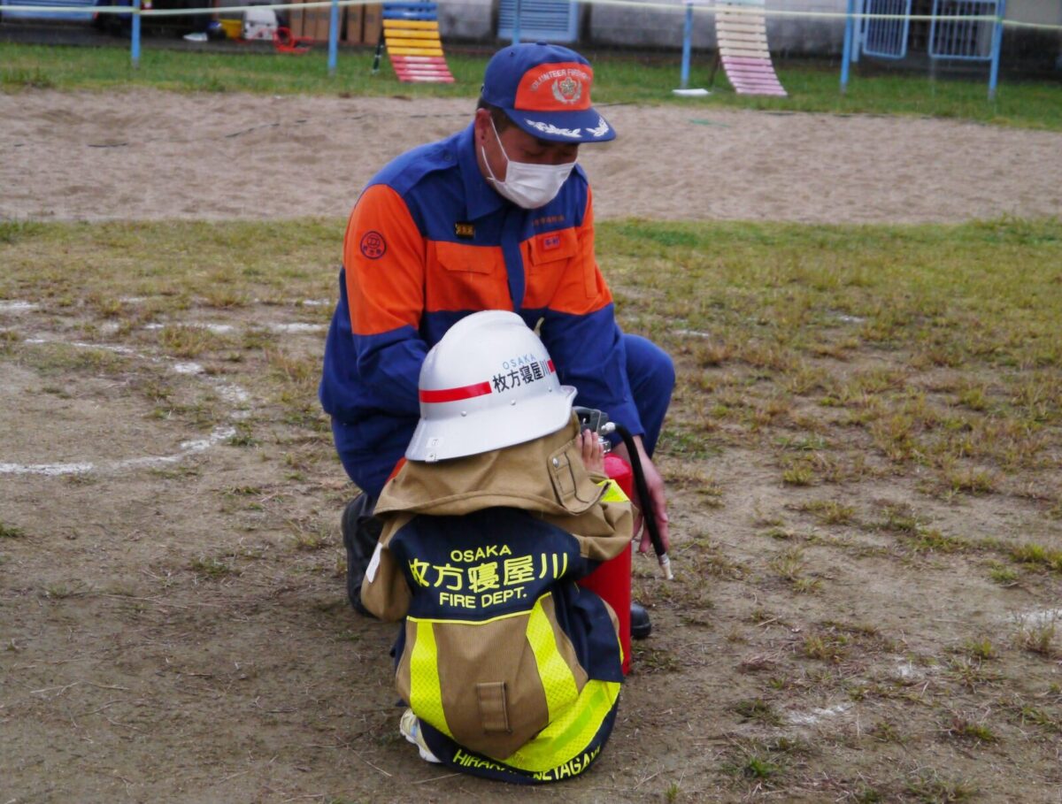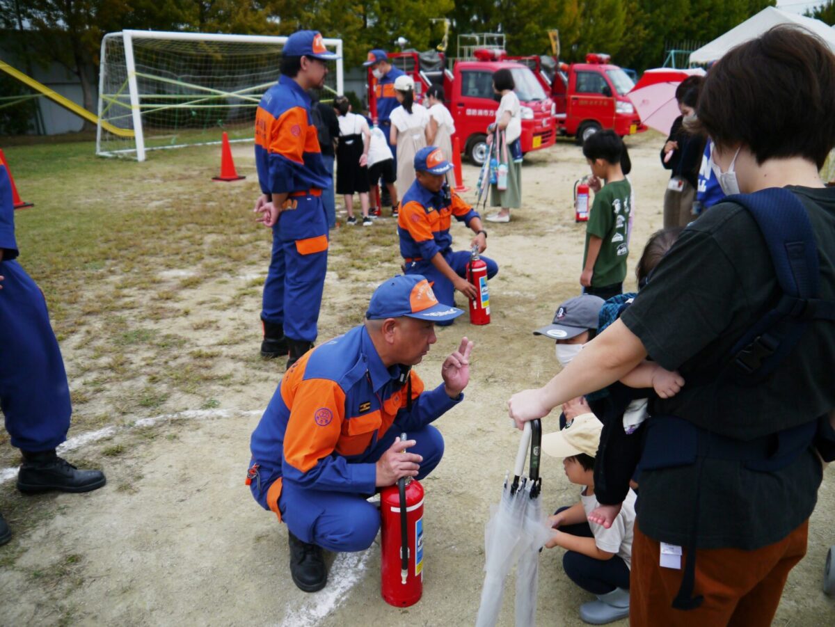 今回16の出店・出展の中、枚方市消防団は子供用消防服を用意し、記念撮影ができるコーナーと水消火器による消火器体験コーナーを担当しました。
