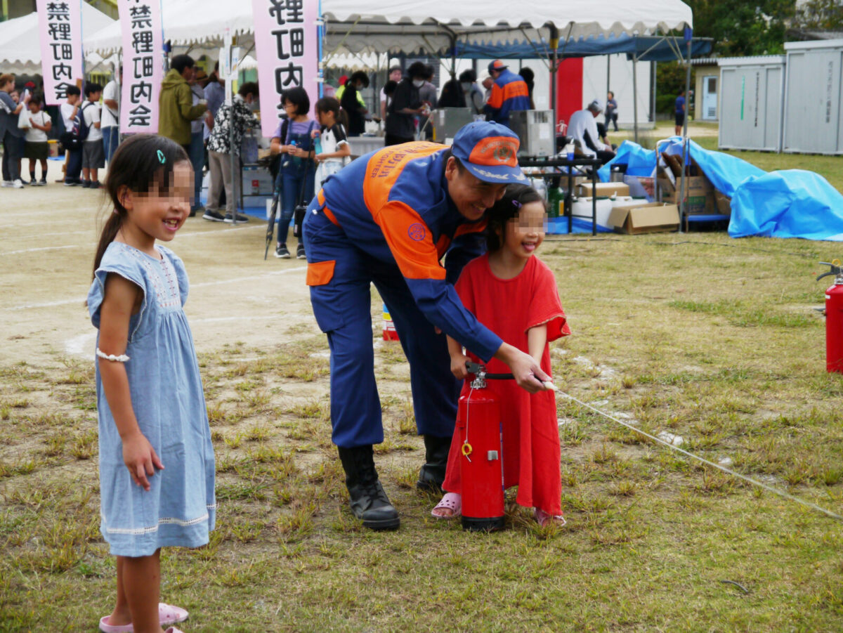 消火器体験には多くのご家族が訪れ、消火器の使い方のレクチャーを受け実際に消火器を噴射する体験をしていただきました。