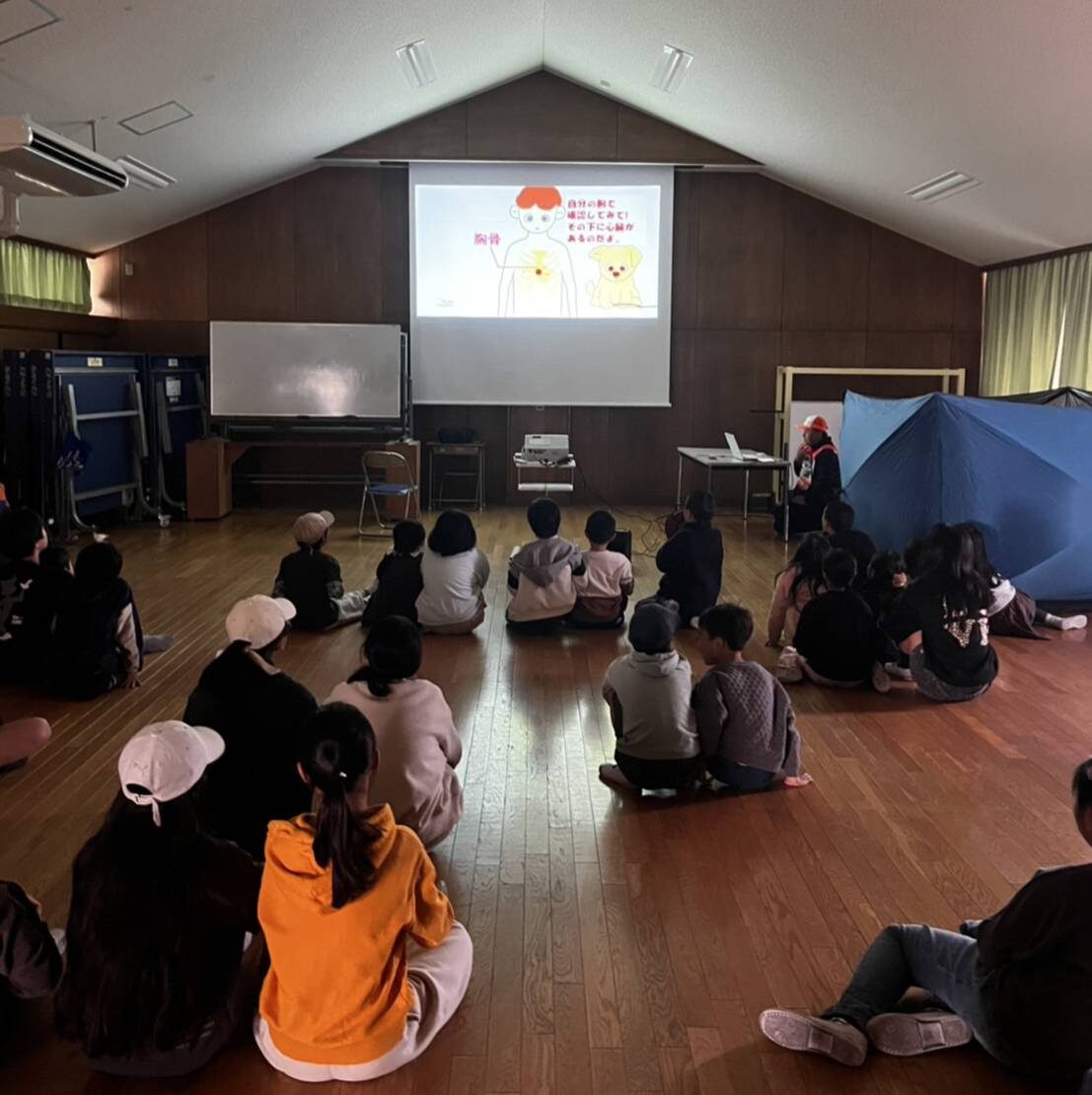 心肺蘇生の教材「たたかう!救急アニメ 救え!ボジョレー!!」倒れている人を発見してから救急車につなぐまで・・を視聴したあとは、歌いながら楽しく覚える救命処置、大阪府消防団員で考案・制作した「救命体操」をみんなで踊り盛り上がります。