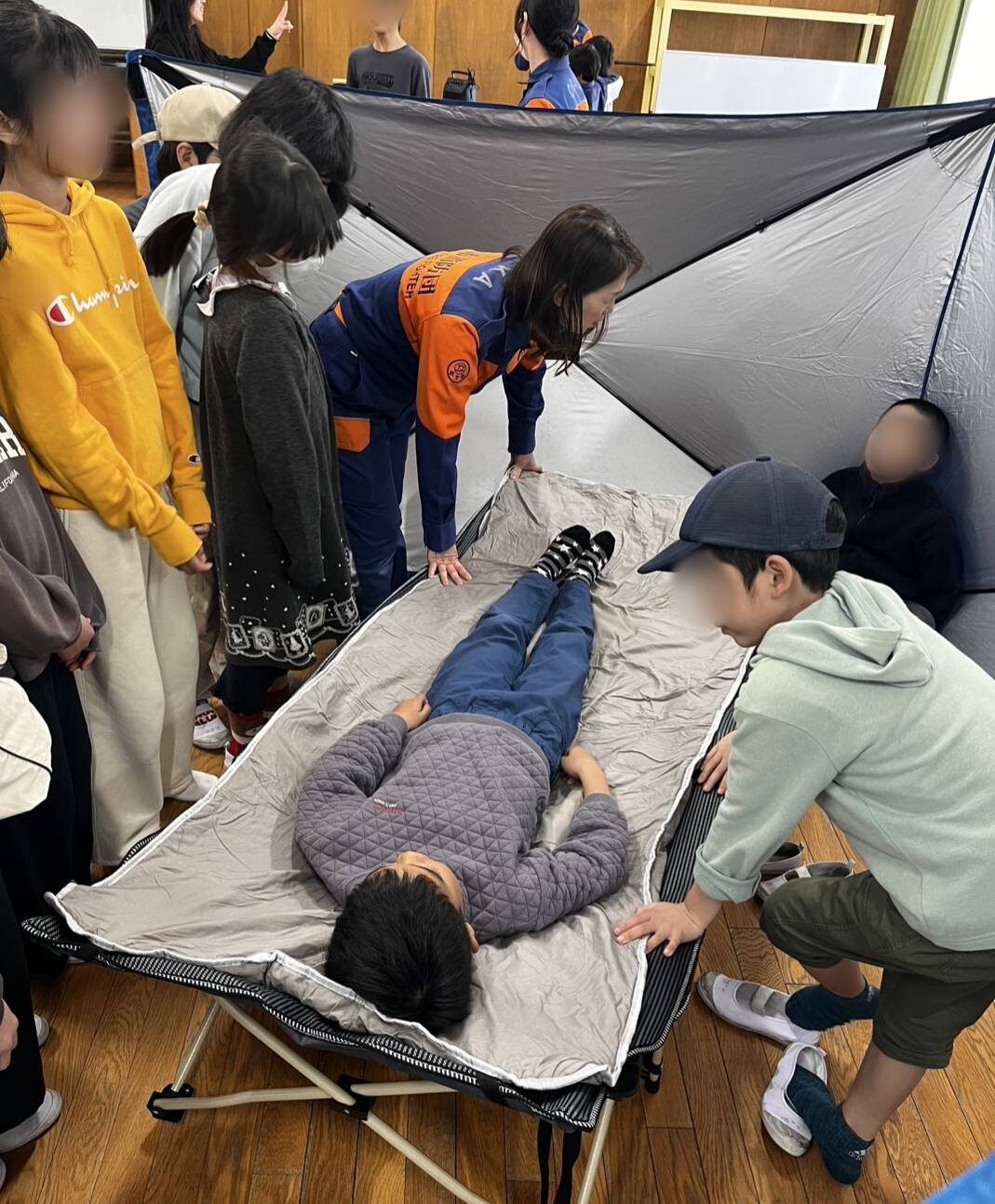 作り方を学び、交代して全員が毛布担架の担ぎ手を体験しました。