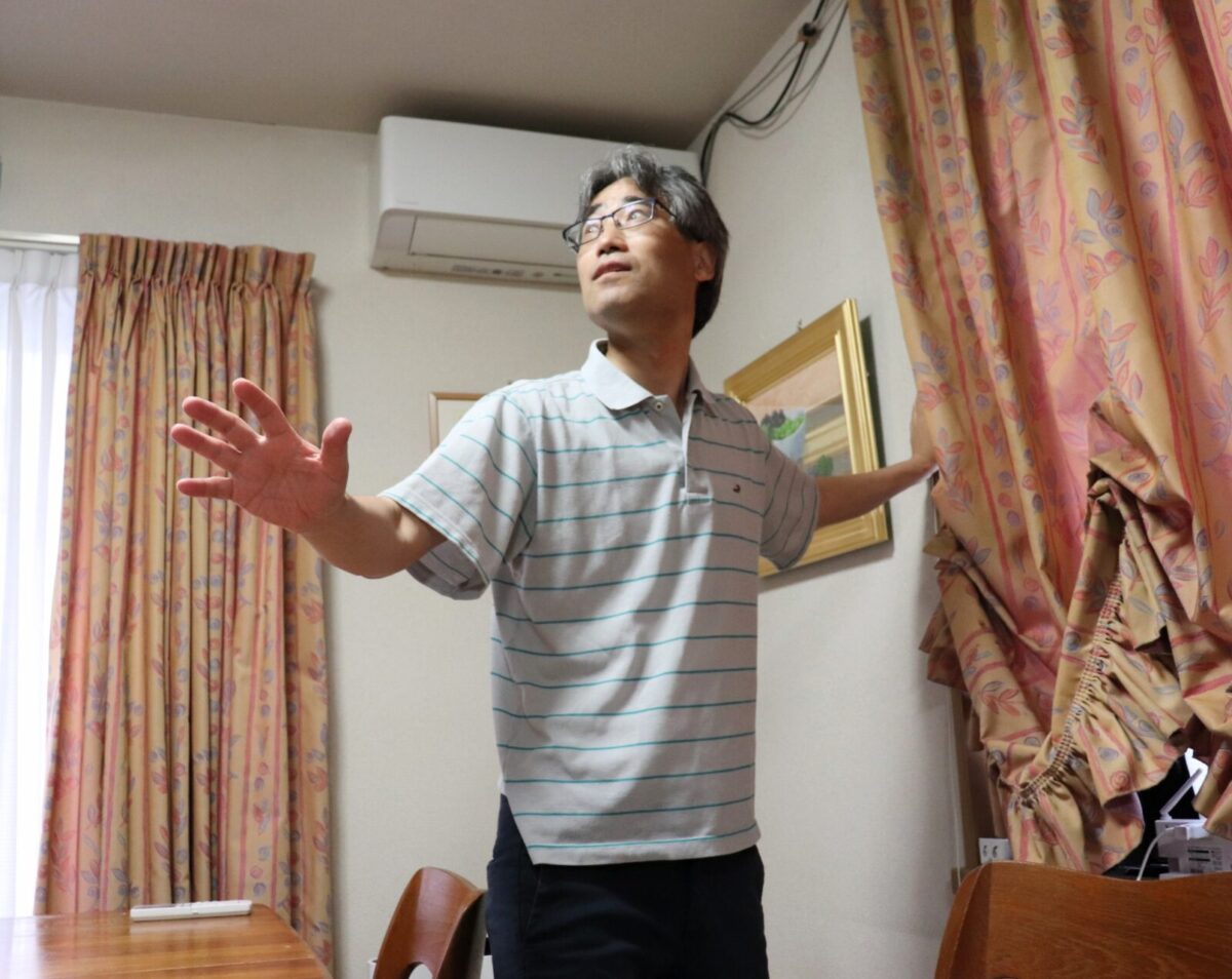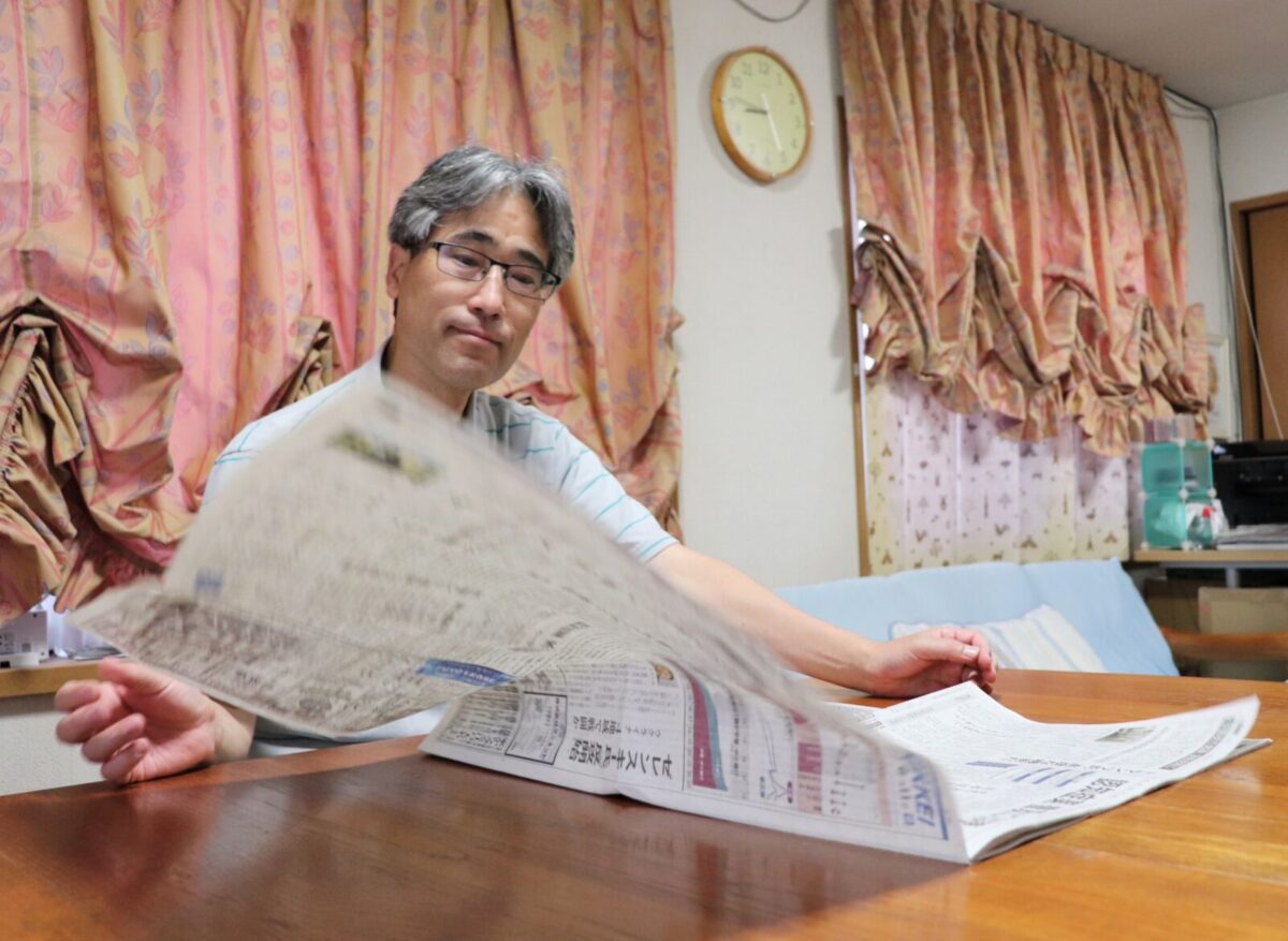 日曜日の朝、居間で新聞を読みながらくつろぐ西川班長