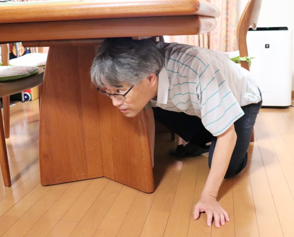 身を守るために机の下へ潜り込み、揺れがおさまるのを待ちます。