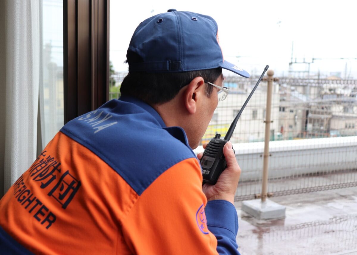 簡潔明瞭にMCA無線で初動に対する交信が行われたあと、すぐさま西川班長は、北中振班に所属する団員とその家族の安否確認を行う業務へ入ると同時に溝口団員へ車庫周辺の被害状況の確認を指示します。