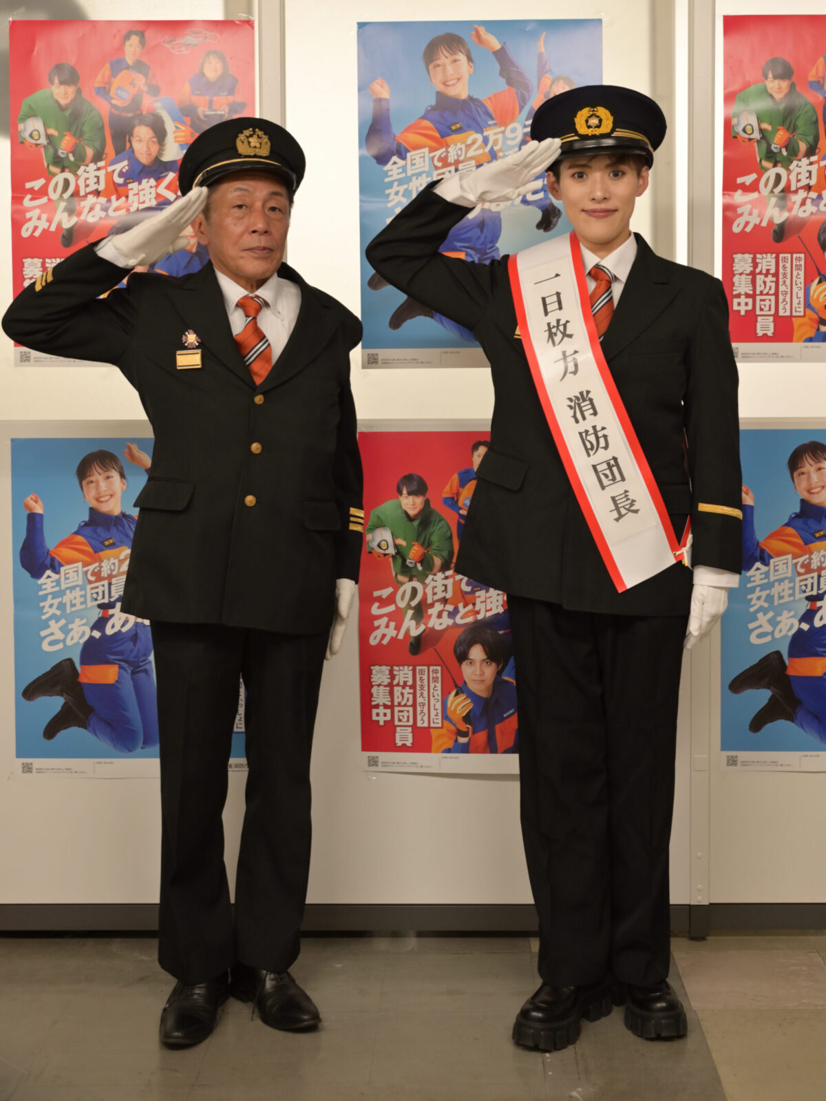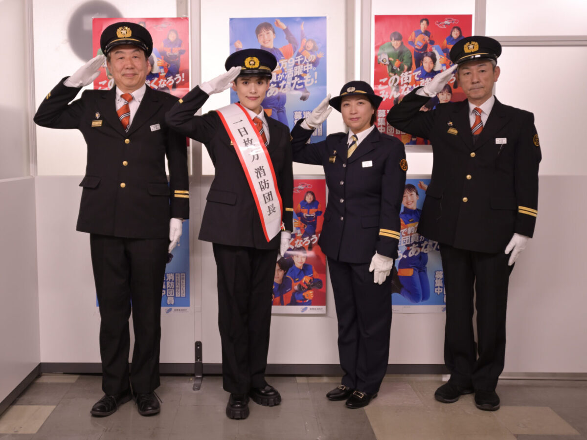 今回の企画は、「地域の安全を守る消防団の存在を広く知ってもらいたい」という想いから実現したもので、翼さんは消防団の制服を身にまとい、中団長らとともに敬礼。