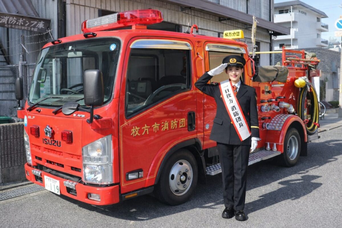 翼和希さんが「一日枚方消防団長」として消防団募集チラシ撮影にご協力いただいたことで、消防団の活動がより身近により誇らしく感じられる撮影となりました。
