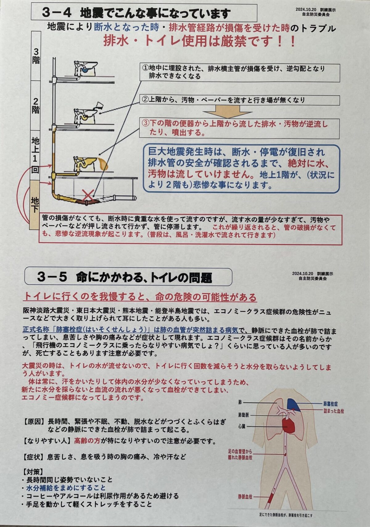 マンション等集合住宅の場合、災害発生後、外見に大きな被害がなくても建物内で配管に割れ・ヒビなど起こっている可能性があり、上階で通常通りにトイレを使うと下階で汚水が漏れ出す事も考えられます。