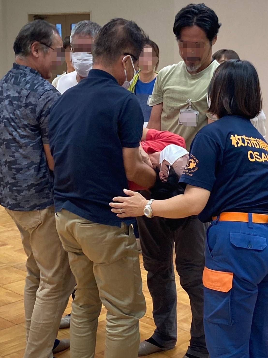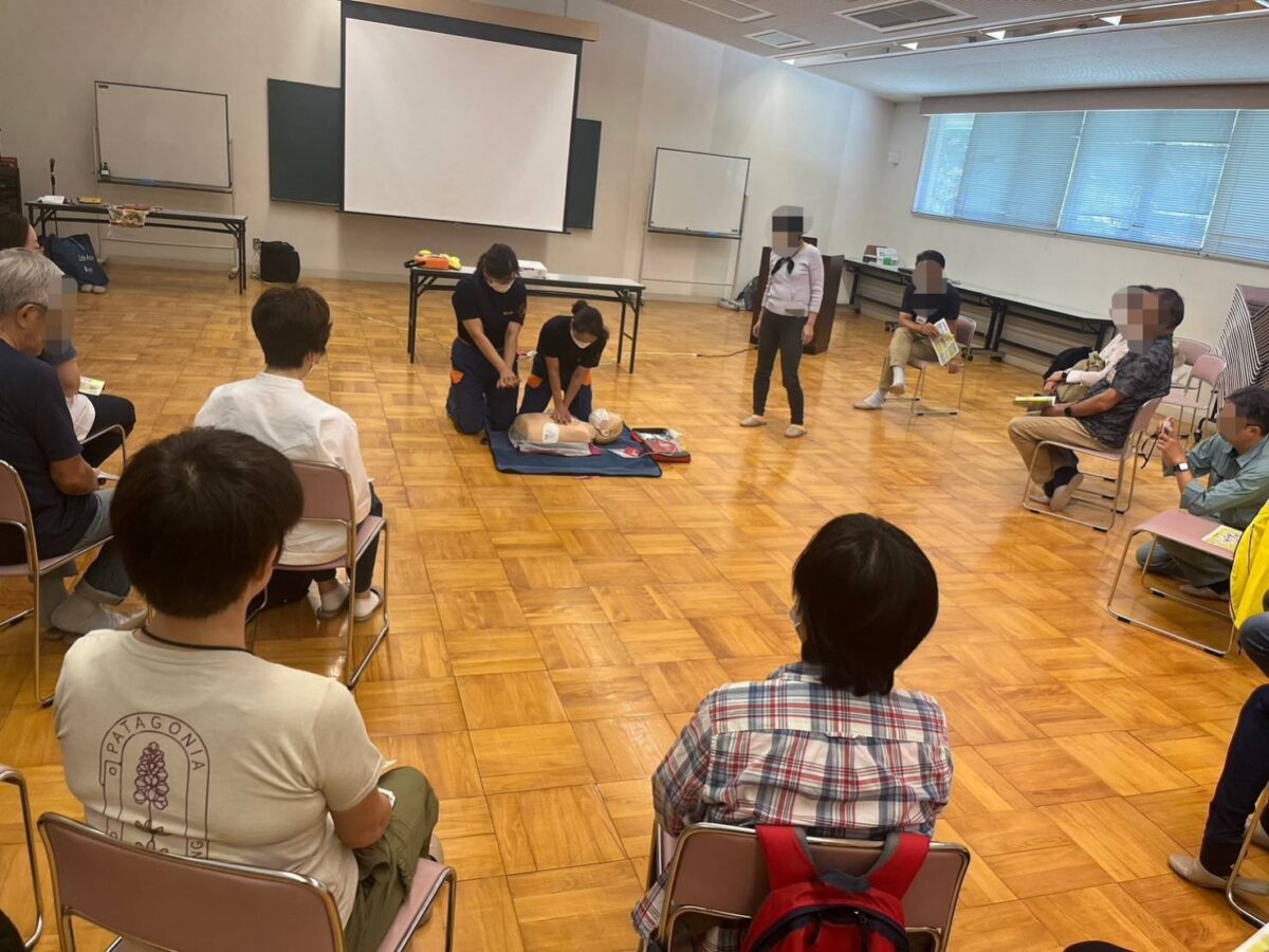 枚方市の里山について勉強し、里山の魅力をたくさん体感できる「里山楽校(さとやまがっこう)」受講生のみなさんへ、AED(自動体外式除細動器)を使った救命講習と、山中で起こり得る怪我の応急手当・傷病者の搬送について講習会を行いました。