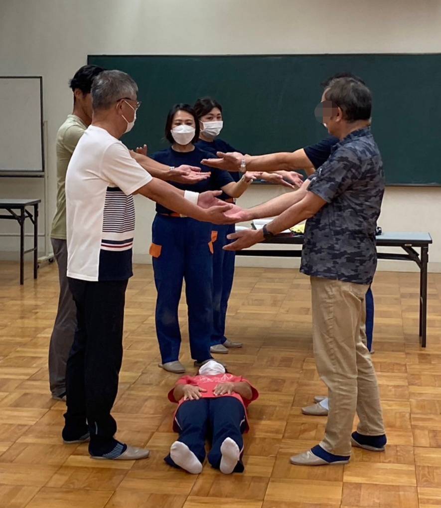 そして担架や道具がない時に、人の力だけで行う搬送方法を身体に負担をかけないコツを交えてお伝えし、皆さんでチャレンジです。