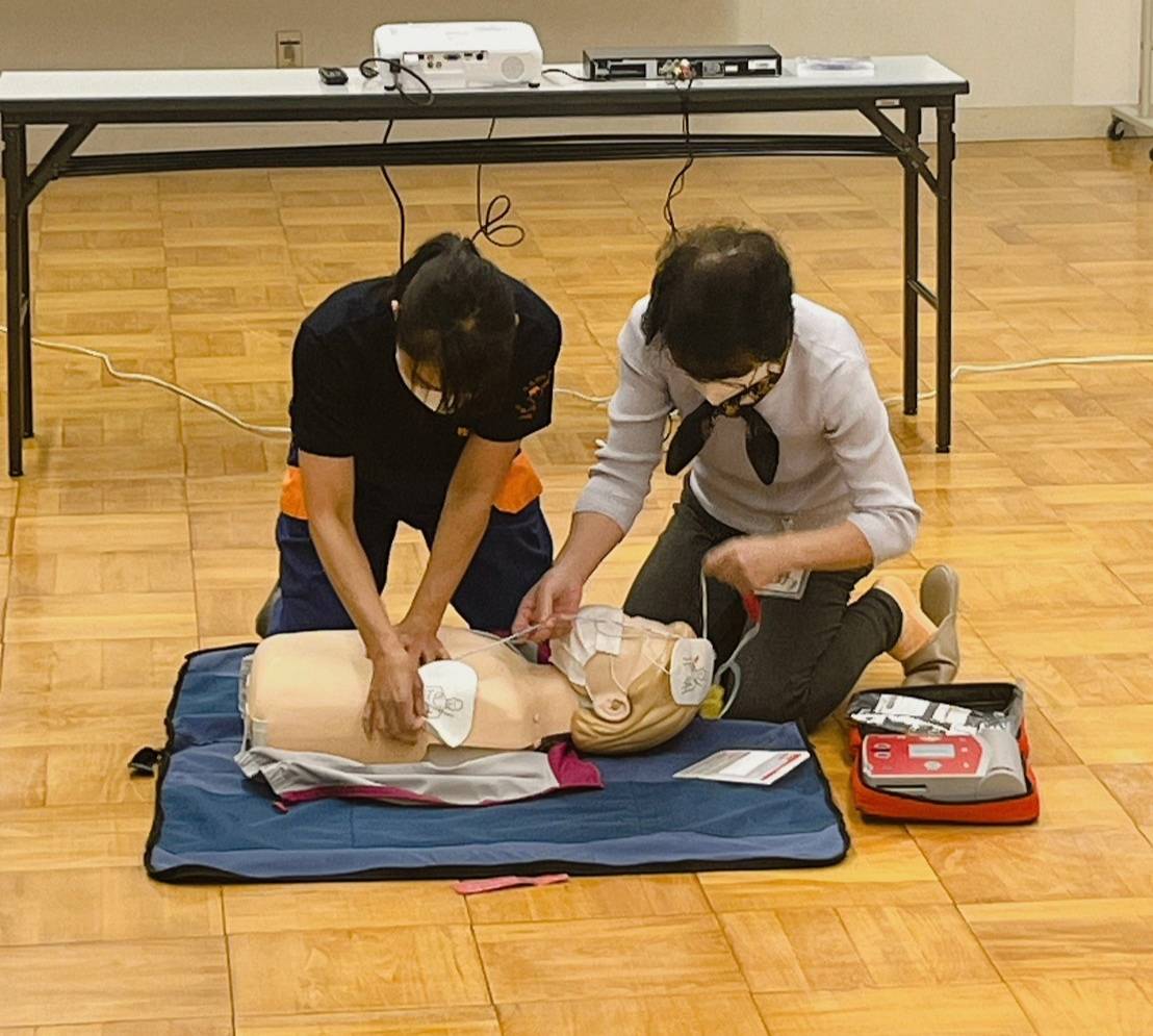 訓練用人形を使っての救命処置の実技では、「相手に怪我をさせるかもしれないと不安があったが、胸骨圧迫の大切さがわかりました。」との感想。